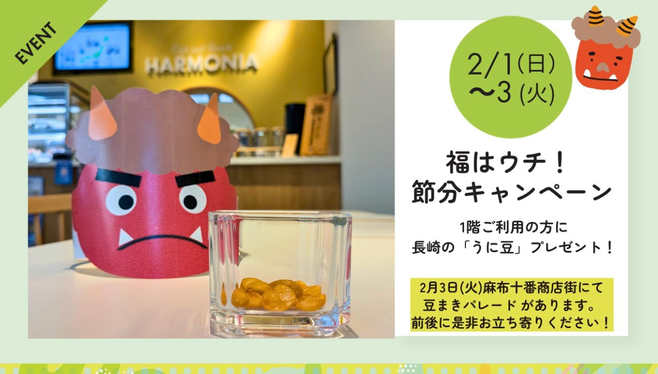 2/1〜3の期間、カフェご利用のお客様に長崎銘菓「うに豆」をプレゼント♪ 3日は麻布十番商店街での豆まきパレードも!ぜひこの機会にお立ち寄りください。