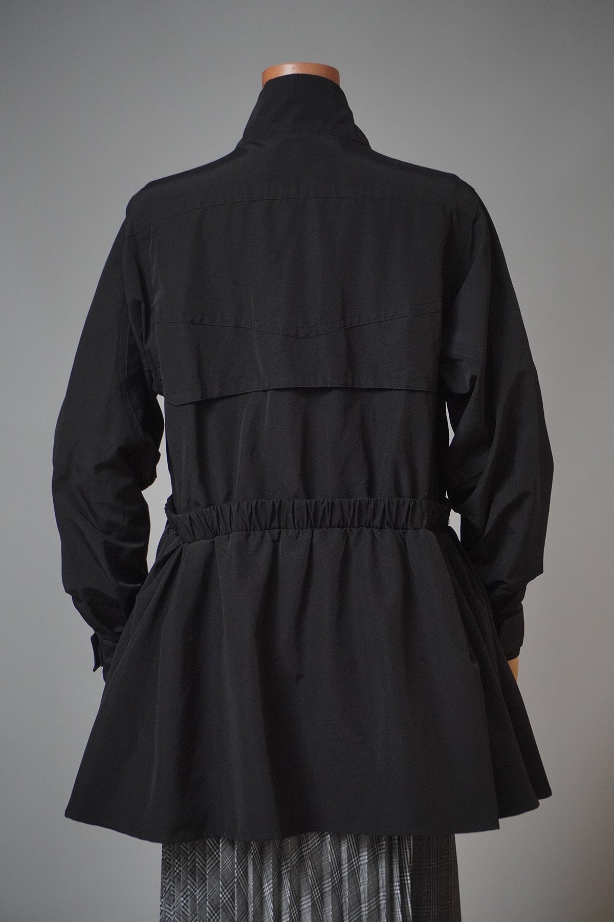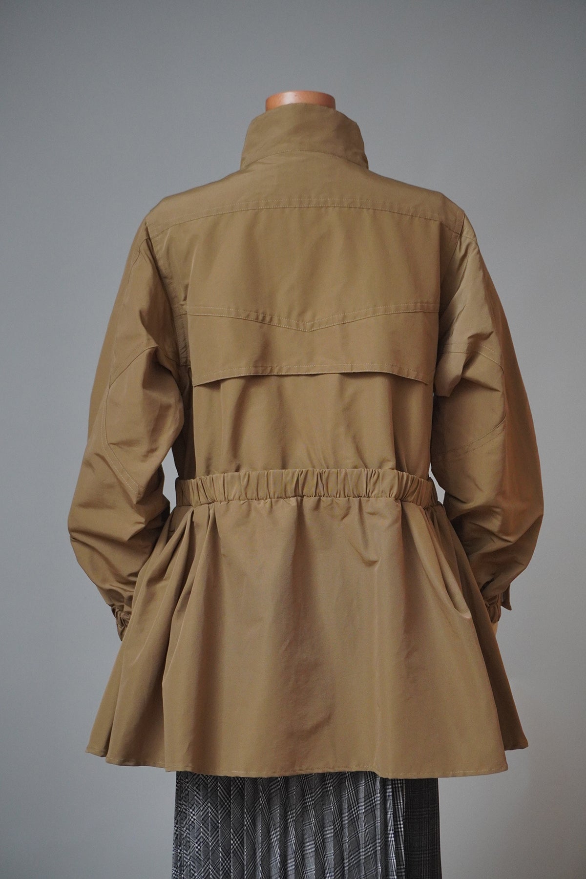 ウエスト部分に絞りのある女性らしいデザインのギャザーブルゾン。