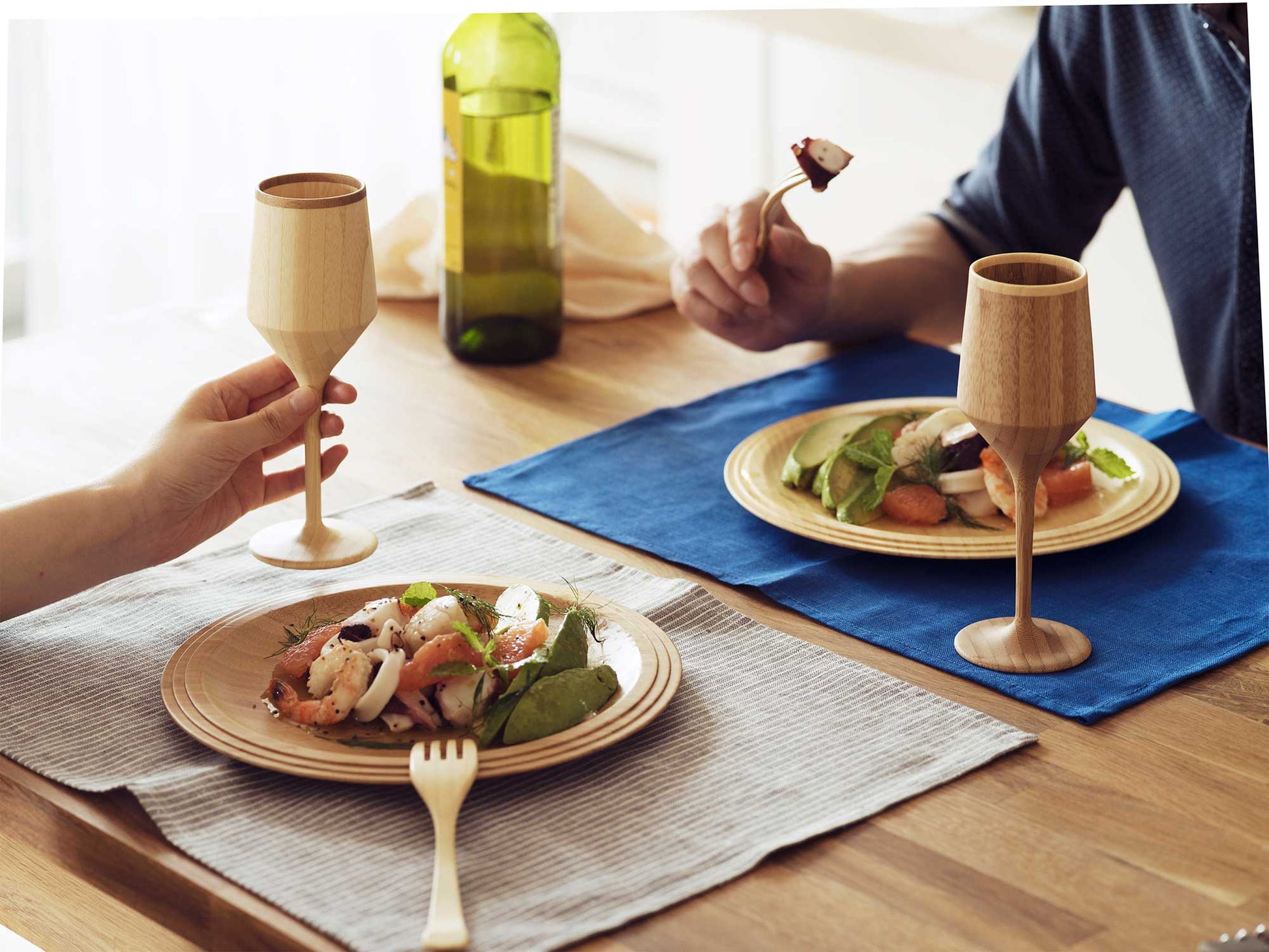 硬さを感じやすい陶器やガラス製食器とくらべ、見た目も質感もやわらかな天然素材食器。「しっくりとなじむ手ざわり」と「やさしくなめらかな口あたり」は天然素材ならでは。