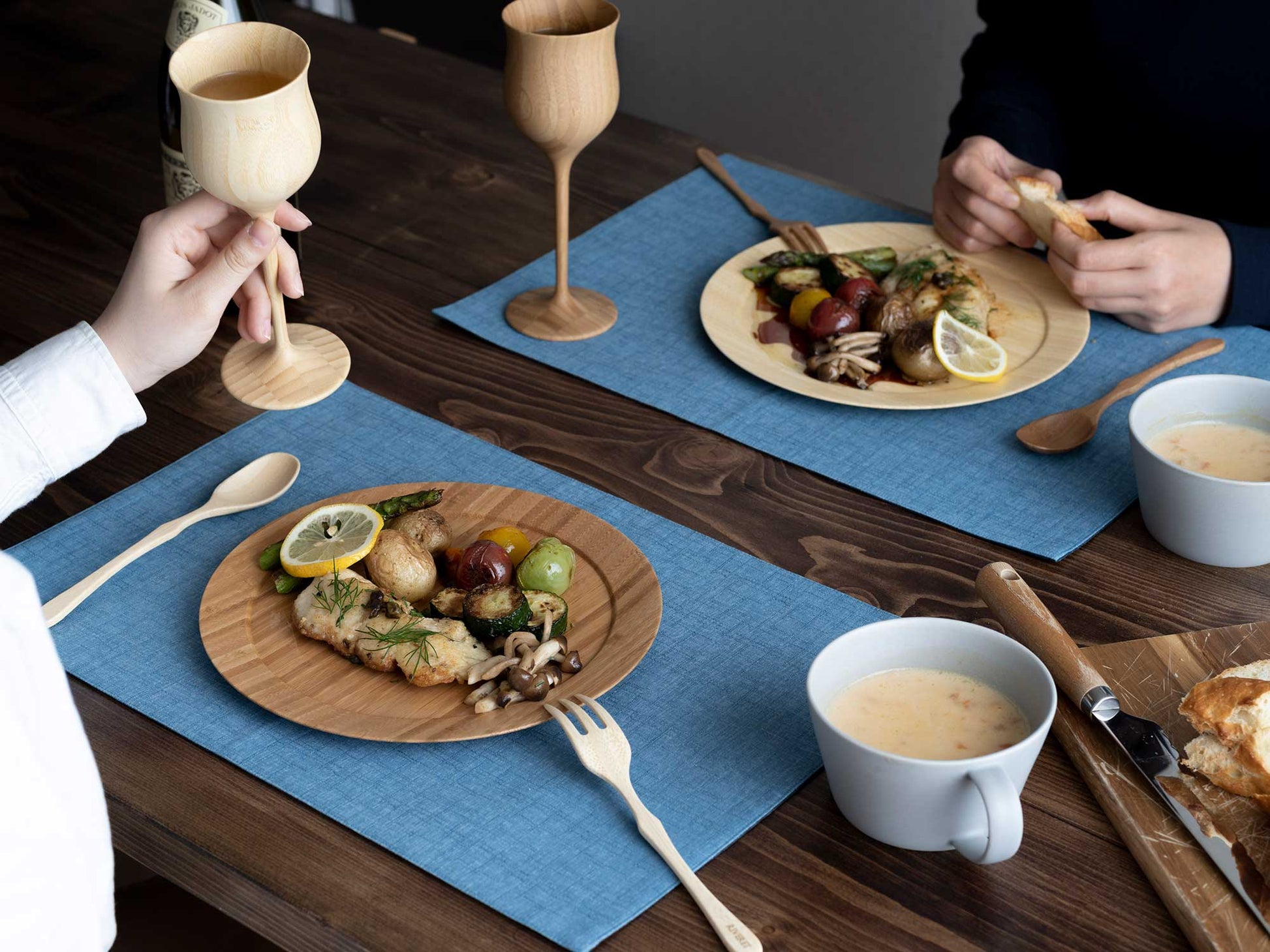 硬さを感じやすい陶器やガラス製食器とくらべ、見た目も質感もやわらかな天然素材食器。「しっくりとなじむ手ざわり」と「やさしくなめらかな口あたり」は天然素材ならでは。