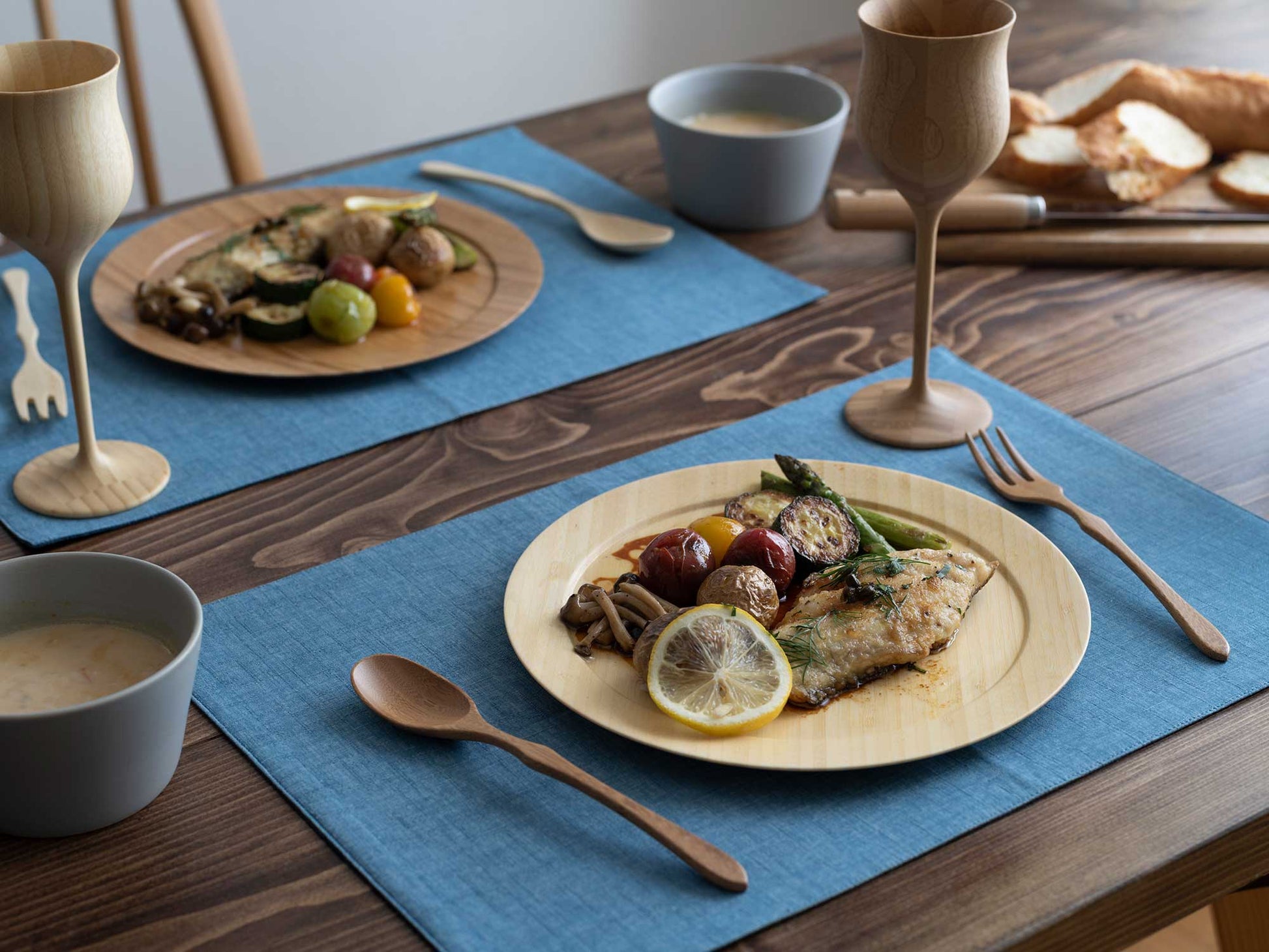 硬さを感じやすい陶器やガラス製食器とくらべ、見た目も質感もやわらかな天然素材食器。「しっくりとなじむ手ざわり」と「やさしくなめらかな口あたり」は天然素材ならでは。