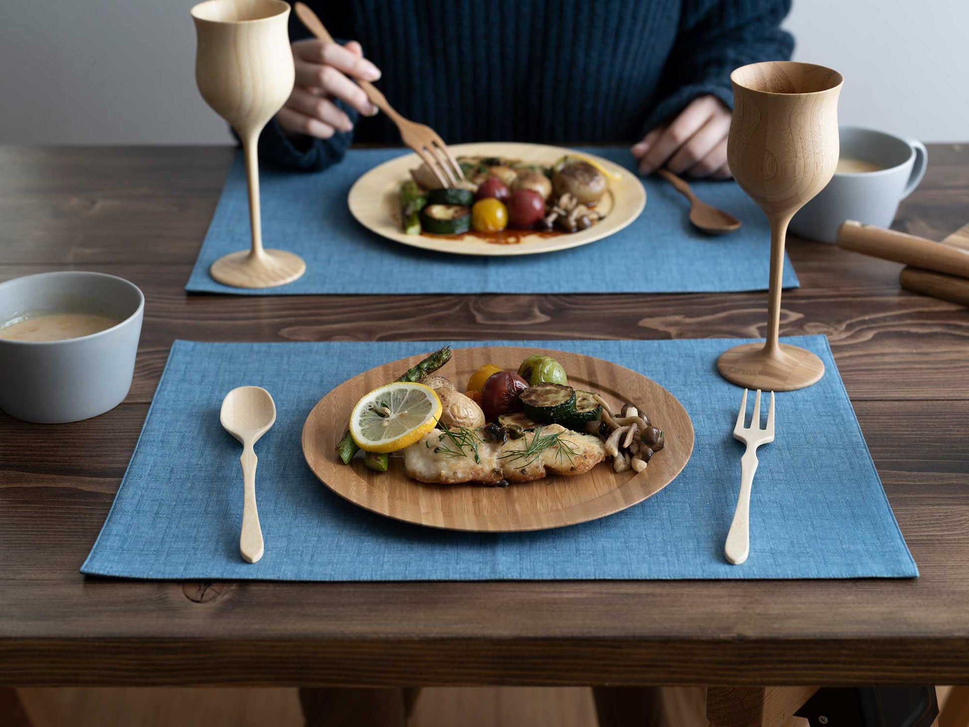 硬さを感じやすい陶器やガラス製食器とくらべ、見た目も質感もやわらかな天然素材食器。「しっくりとなじむ手ざわり」と「やさしくなめらかな口あたり」は天然素材ならでは。