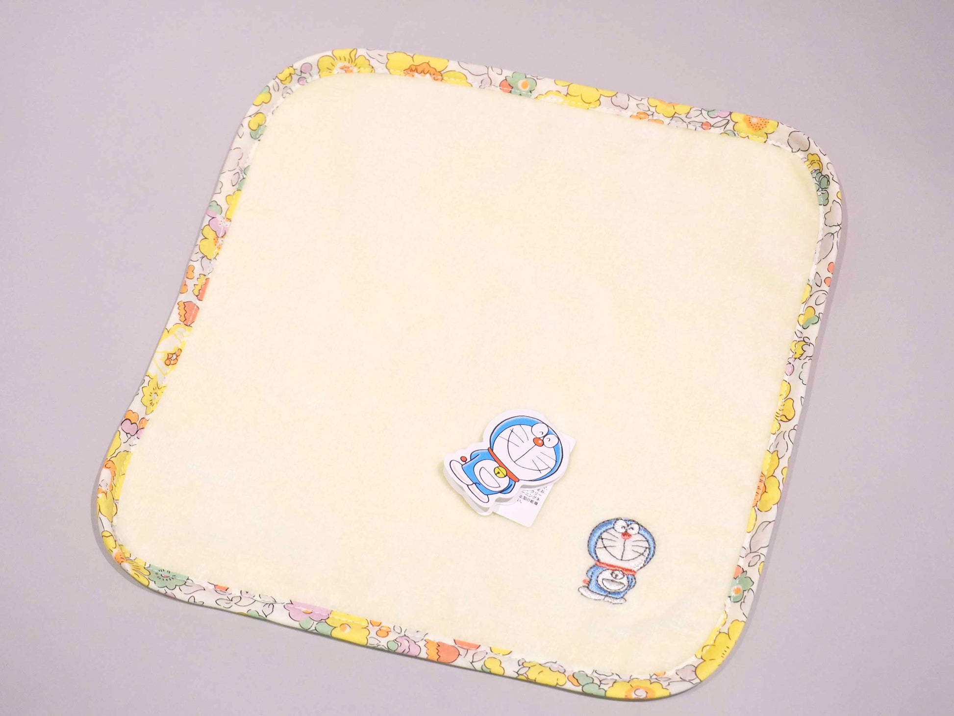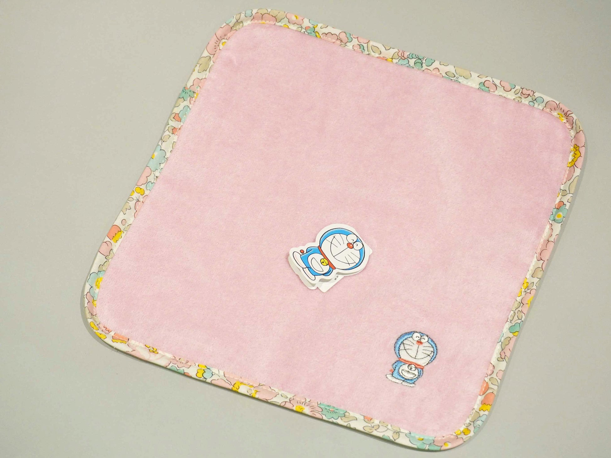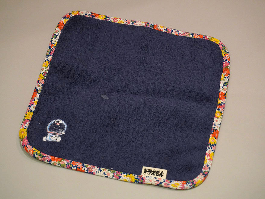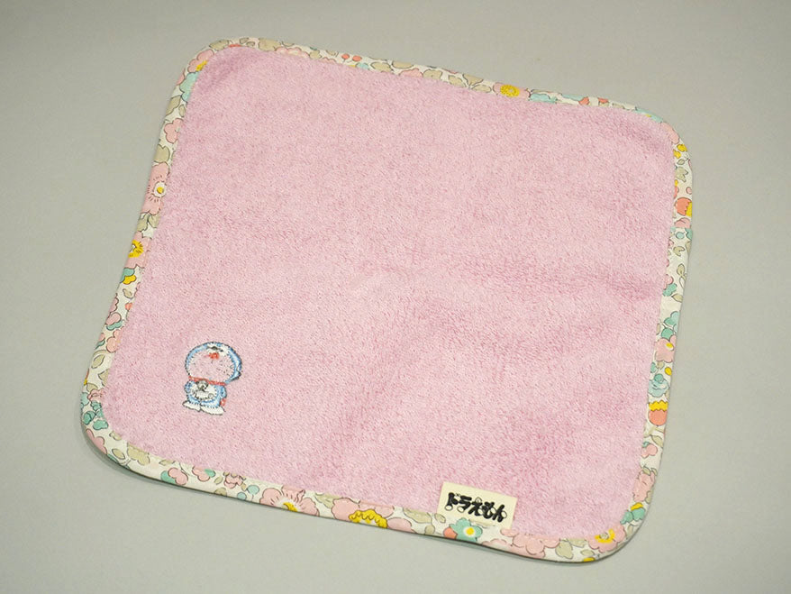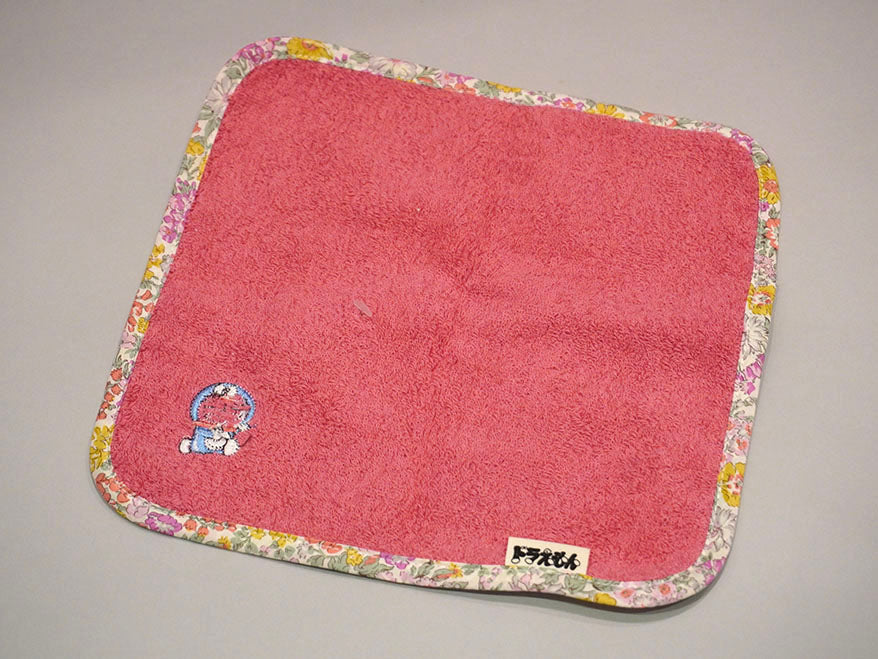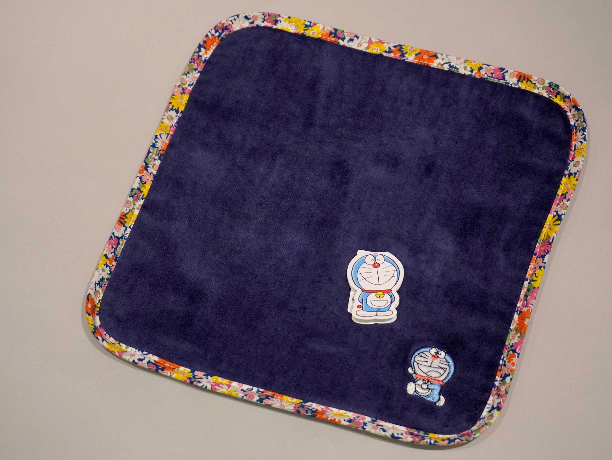 カラフルなリバティファブリックをパイピングし、ドラえもんのキュートなワンポイント刺繍をあしらったタオルハンカチです。