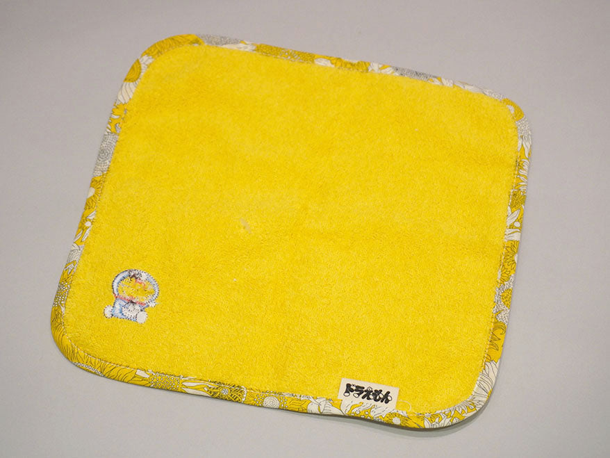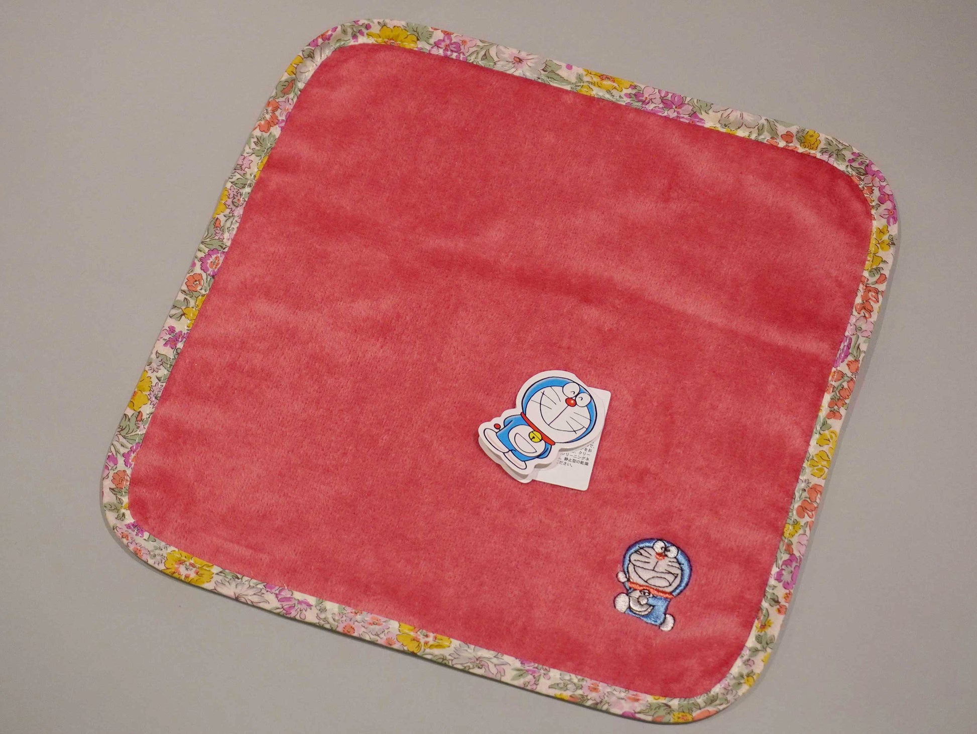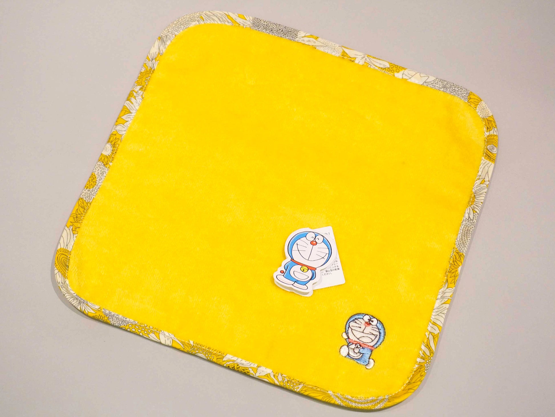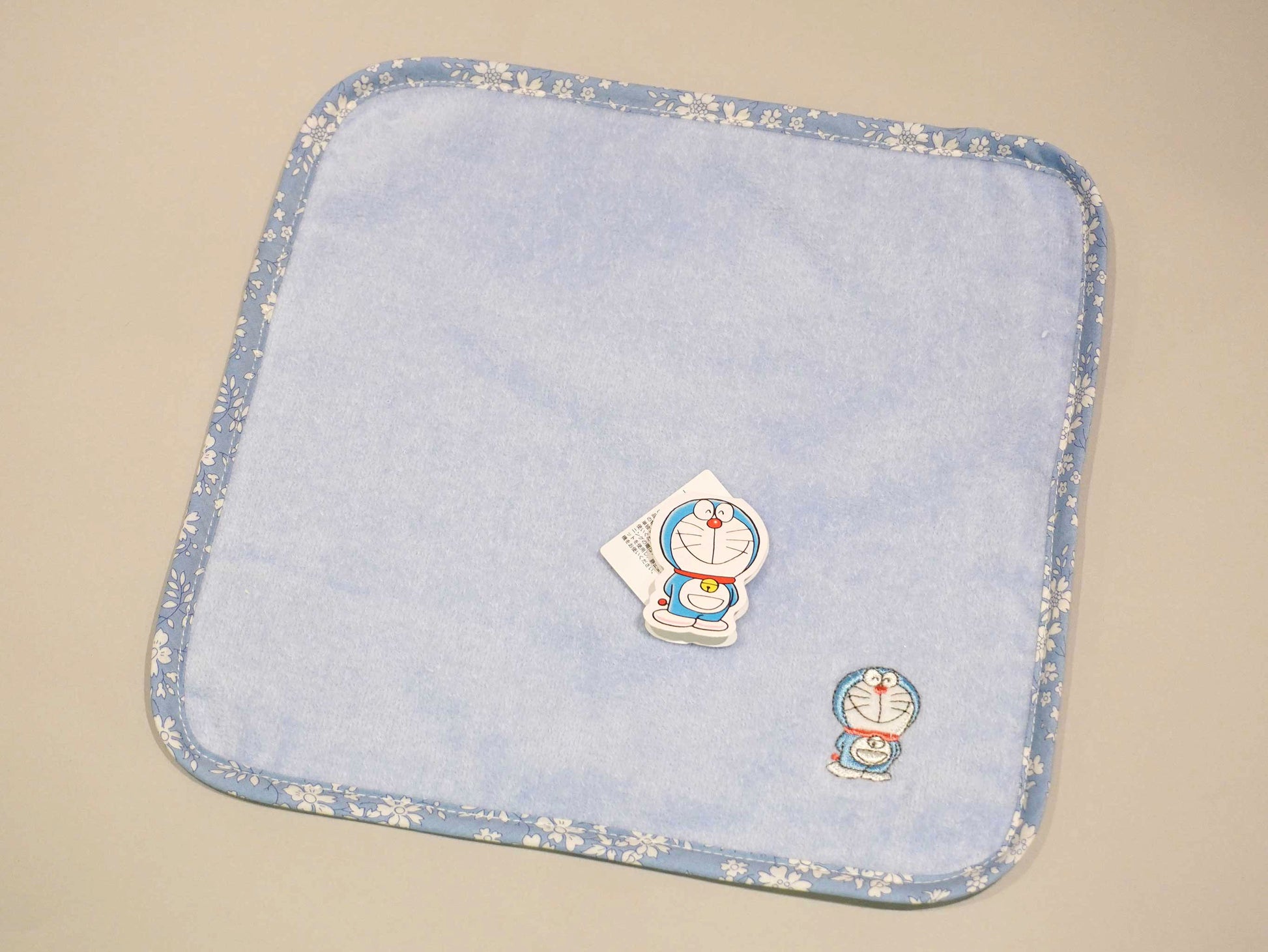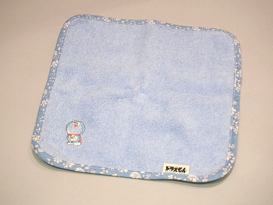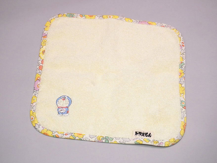 カラフルなリバティファブリックをパイピングし、ドラえもんのキュートなワンポイント刺繍をあしらったタオルハンカチです。