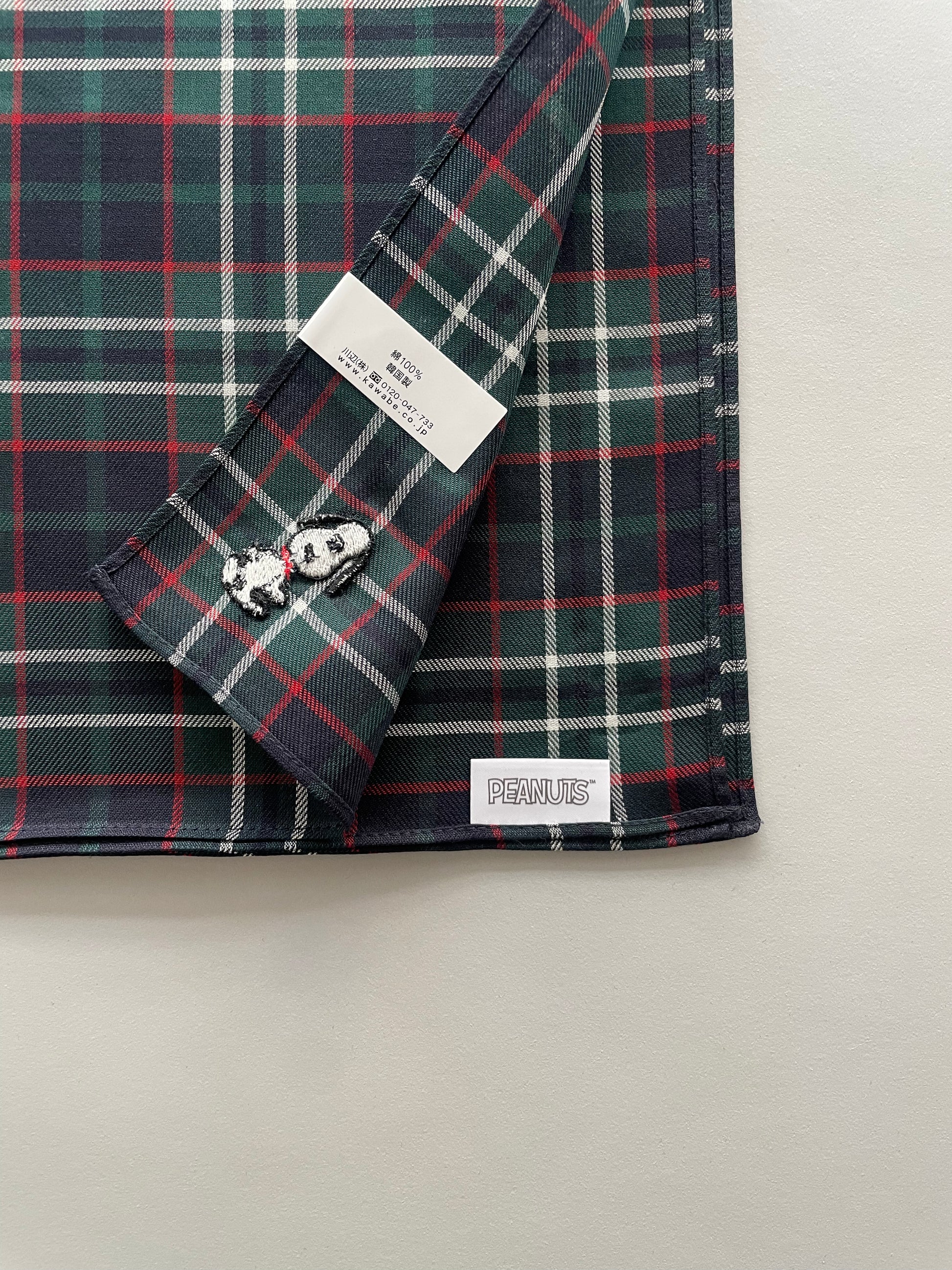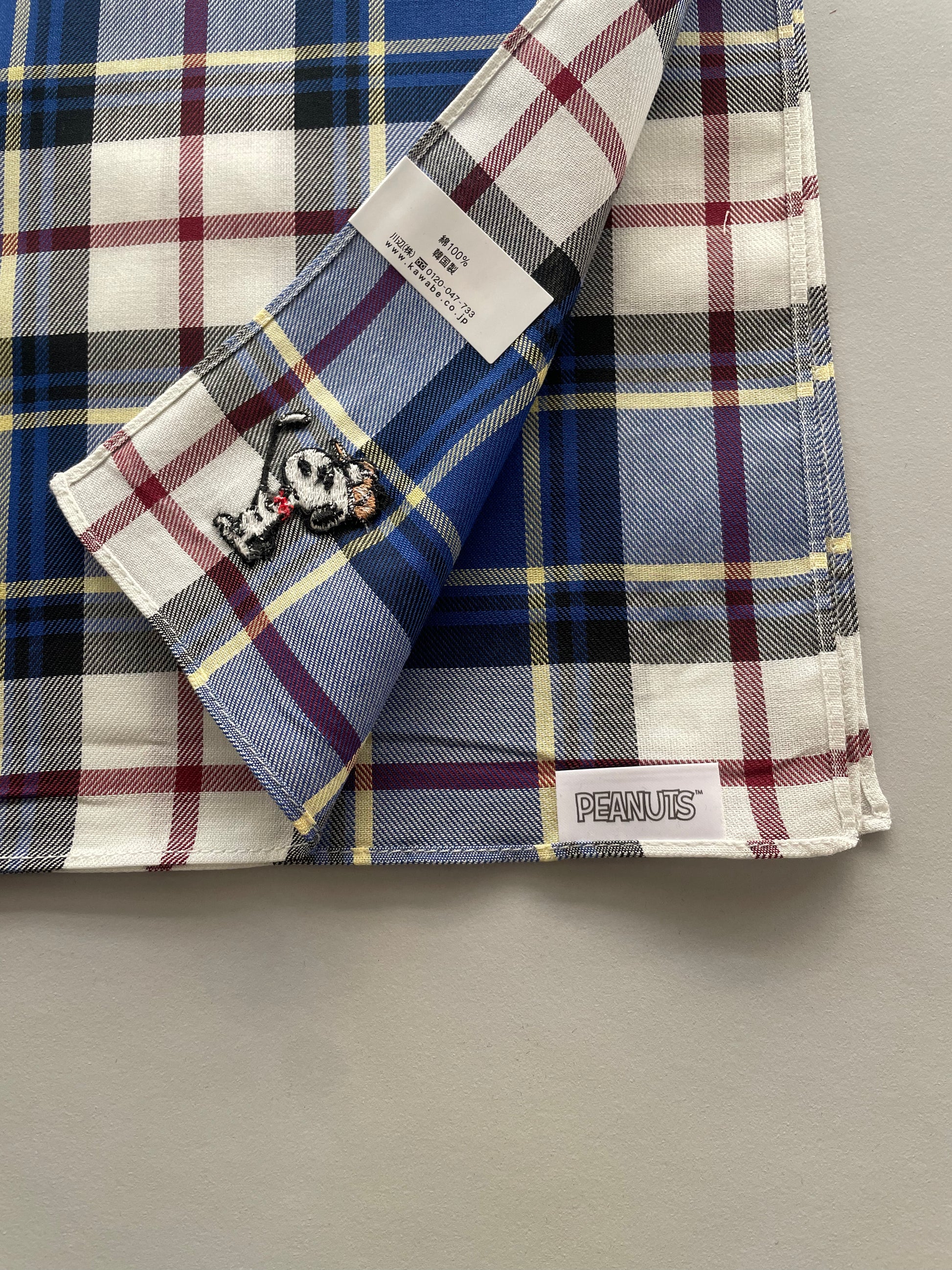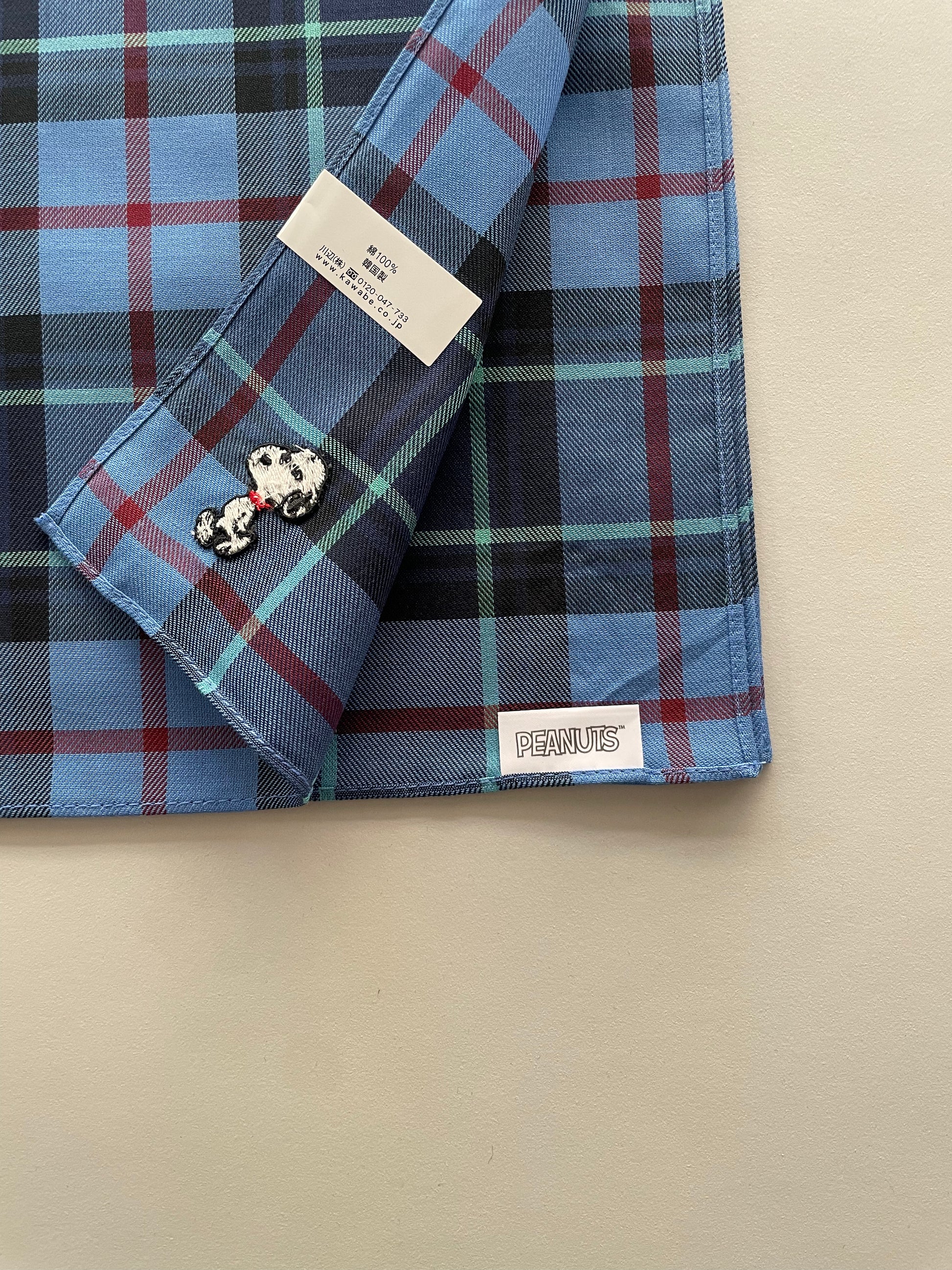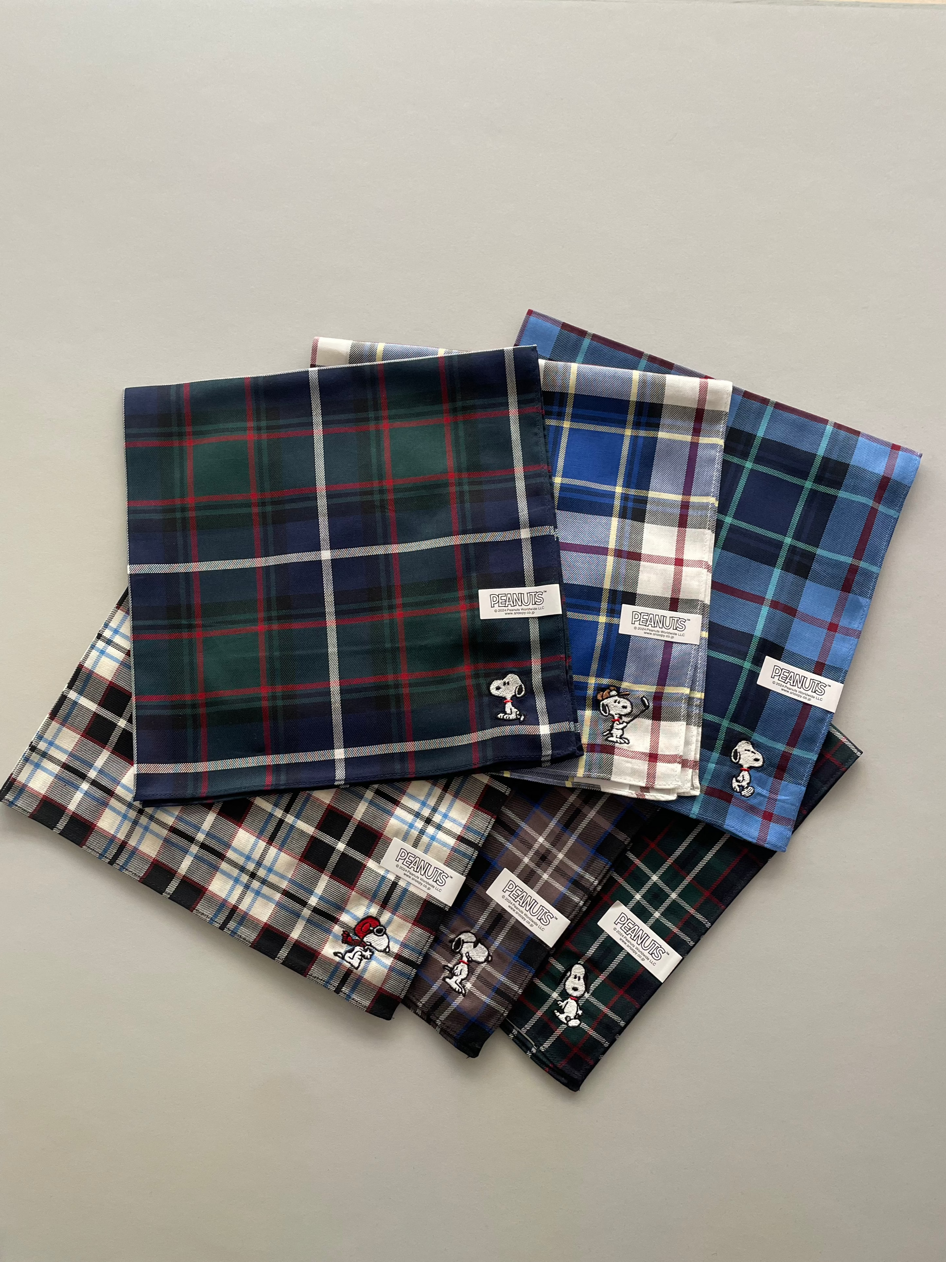 落ち着いたカラー展開のチェック柄ハンカチは、刺繍のスヌーピーがワンポイント。年齢・性別問わず使い勝手の良いアイテムです。