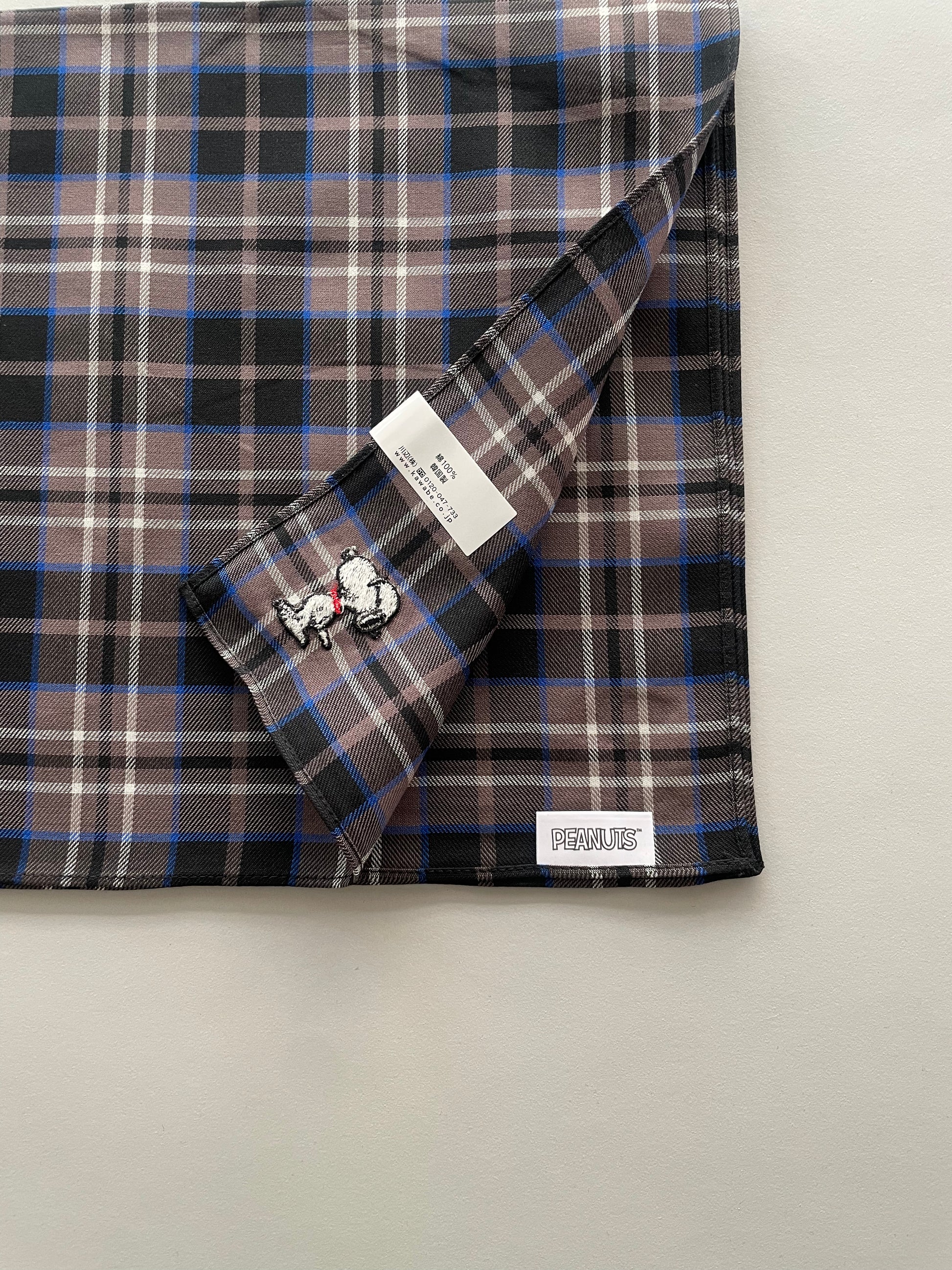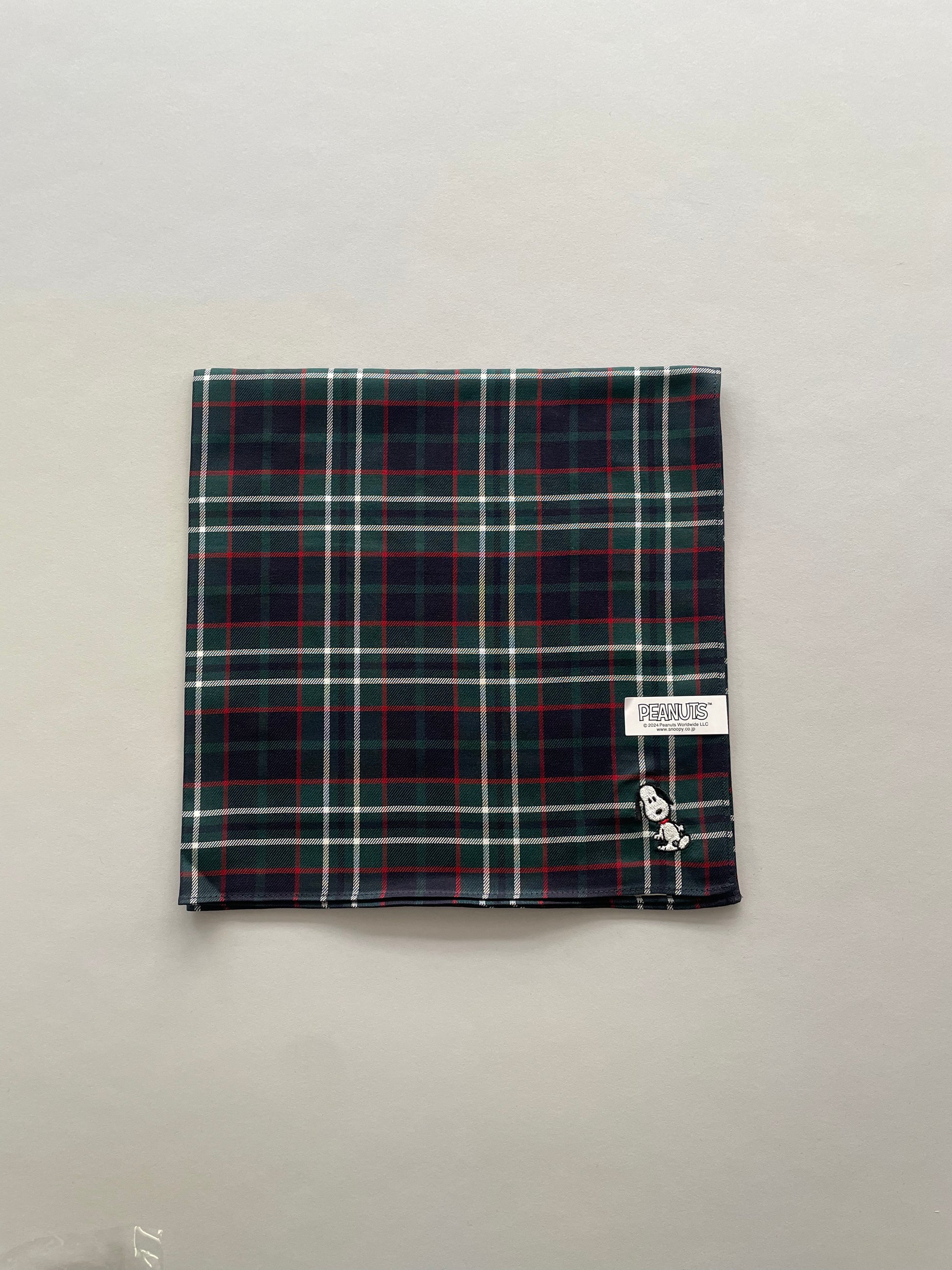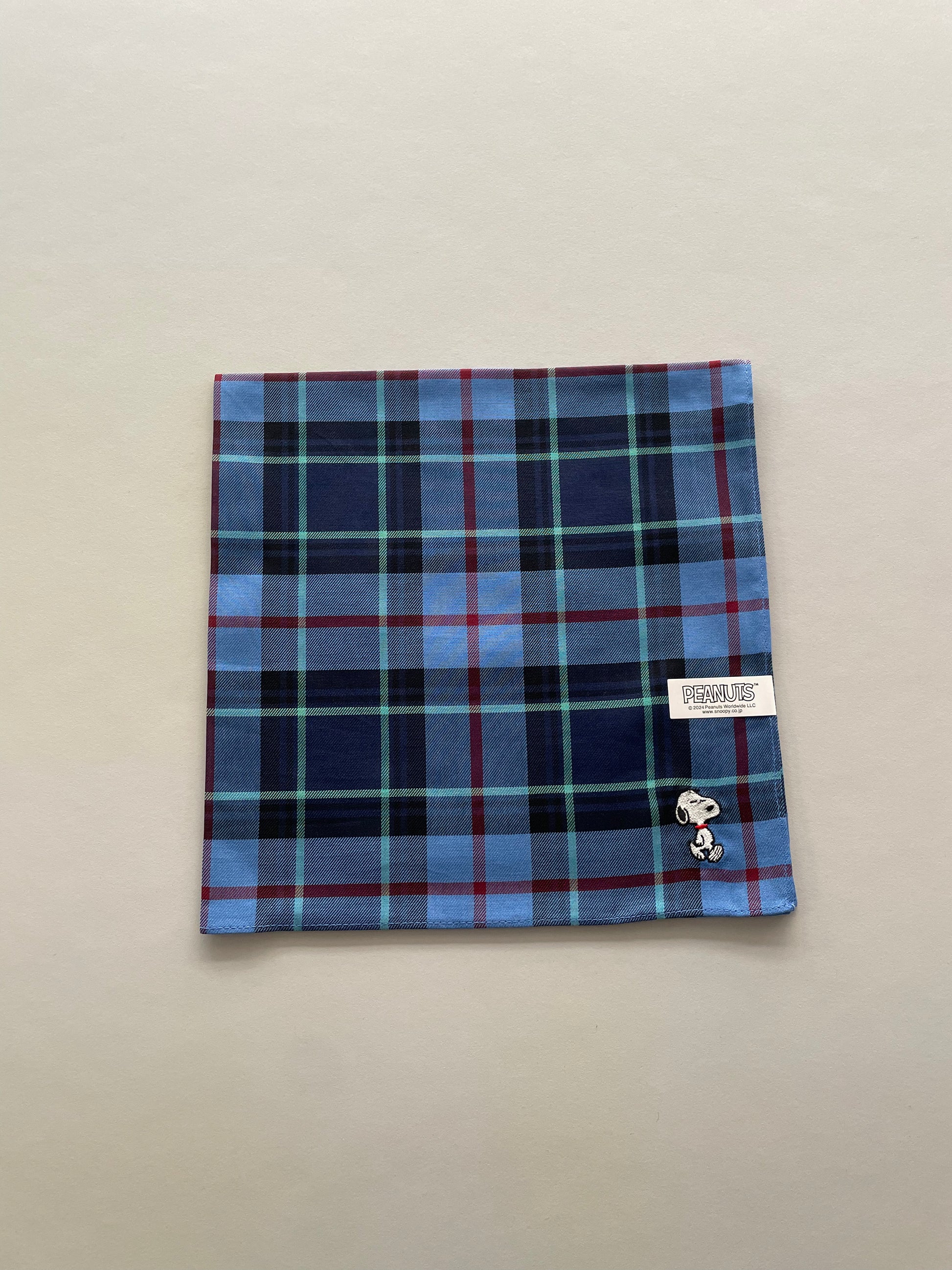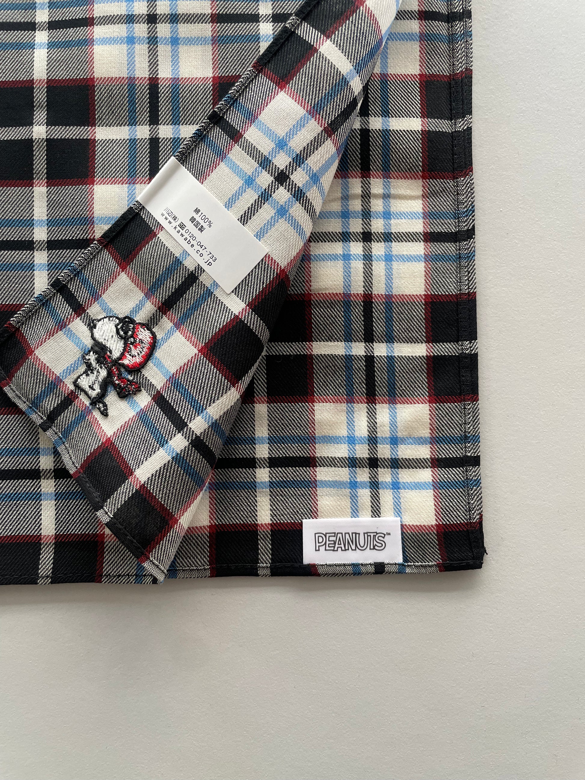 落ち着いたカラー展開のチェック柄ハンカチは、刺繍のスヌーピーがワンポイント。年齢・性別問わず使い勝手の良いアイテムです。