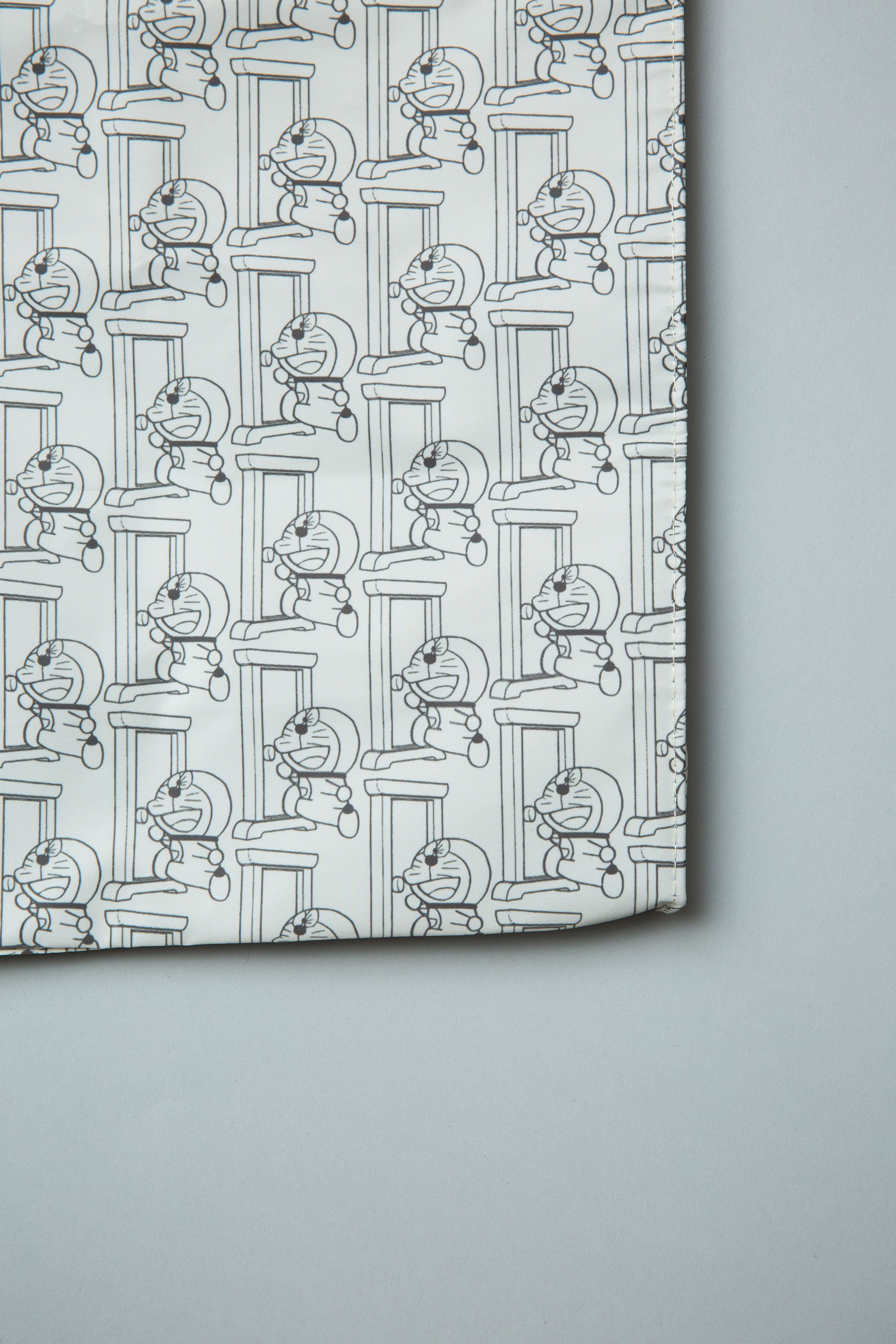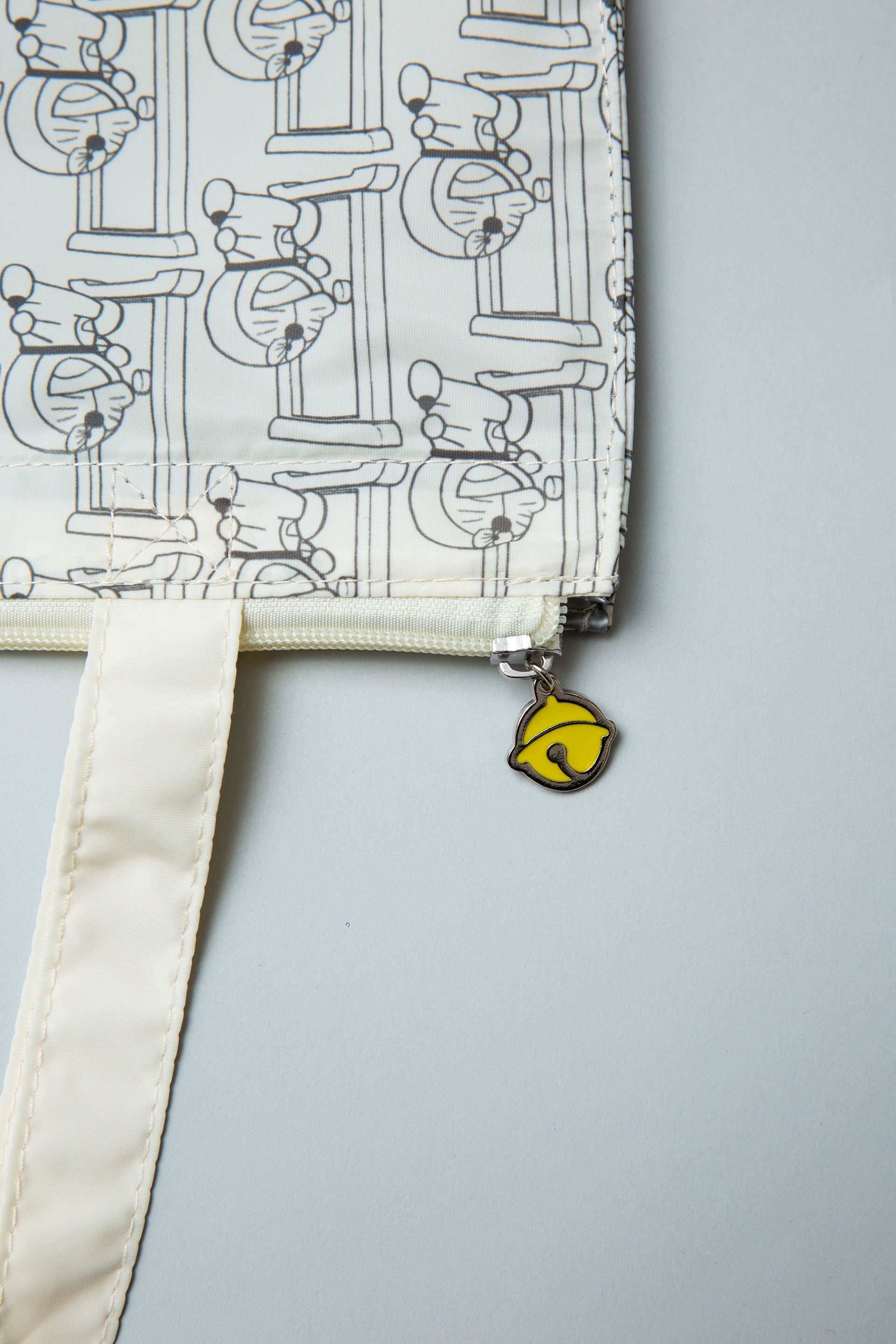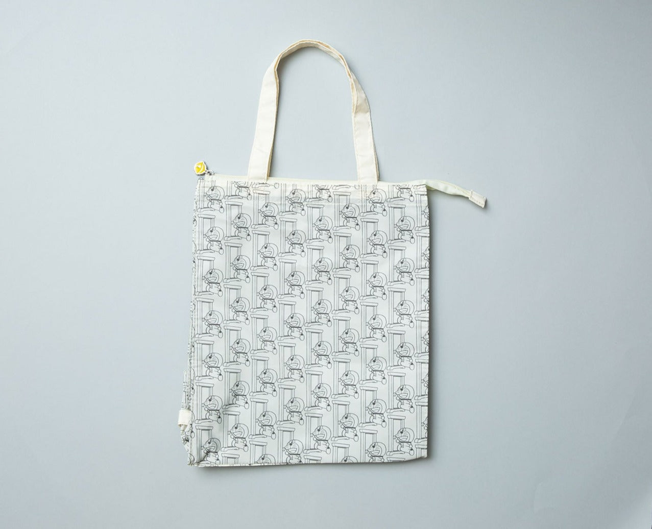 ドラえもんとどこでもドアがいっぱいなデザイン。シンプルな色づかいがポイントです。小さく折りたためるので持ち運びにとっても便利。