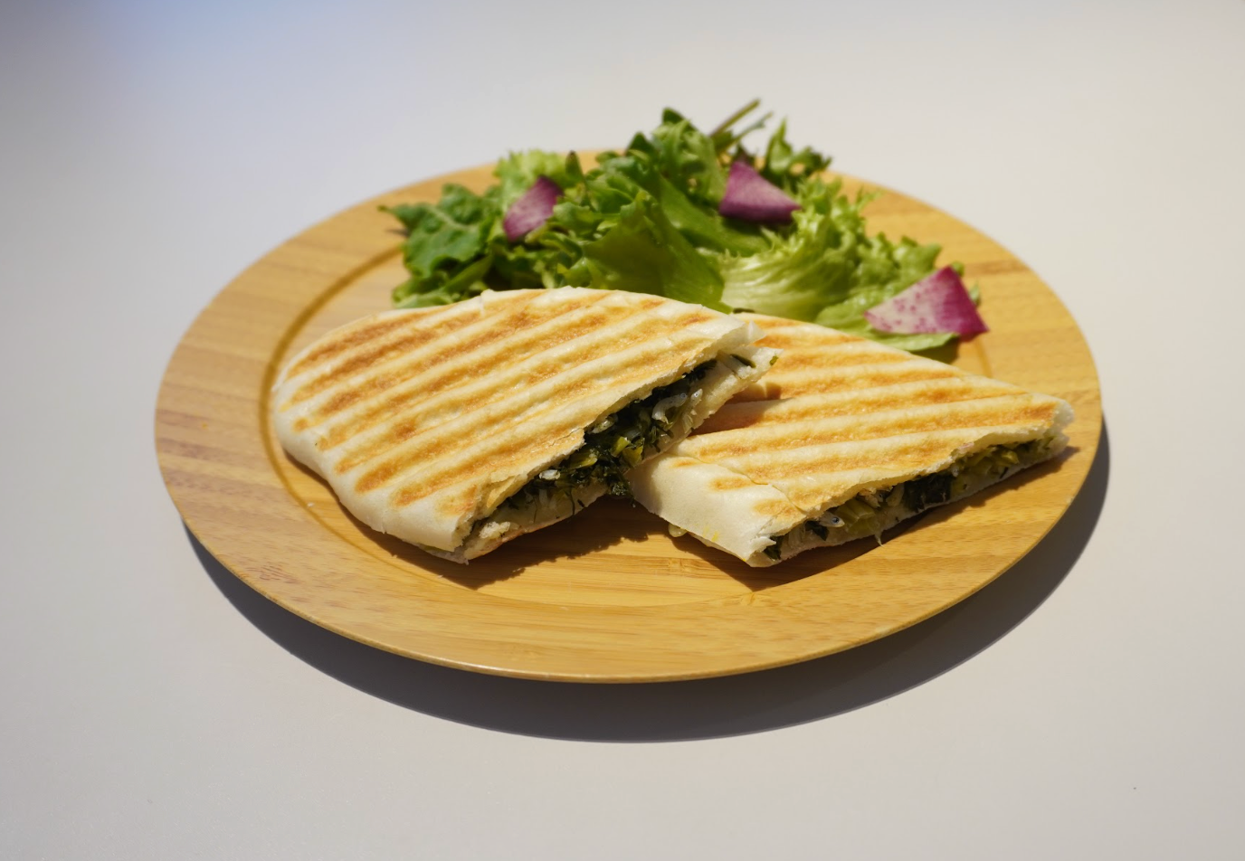 信州の野沢菜おやきをイメージしたパニーニ。信州野沢菜、湘南しらすを使っています。