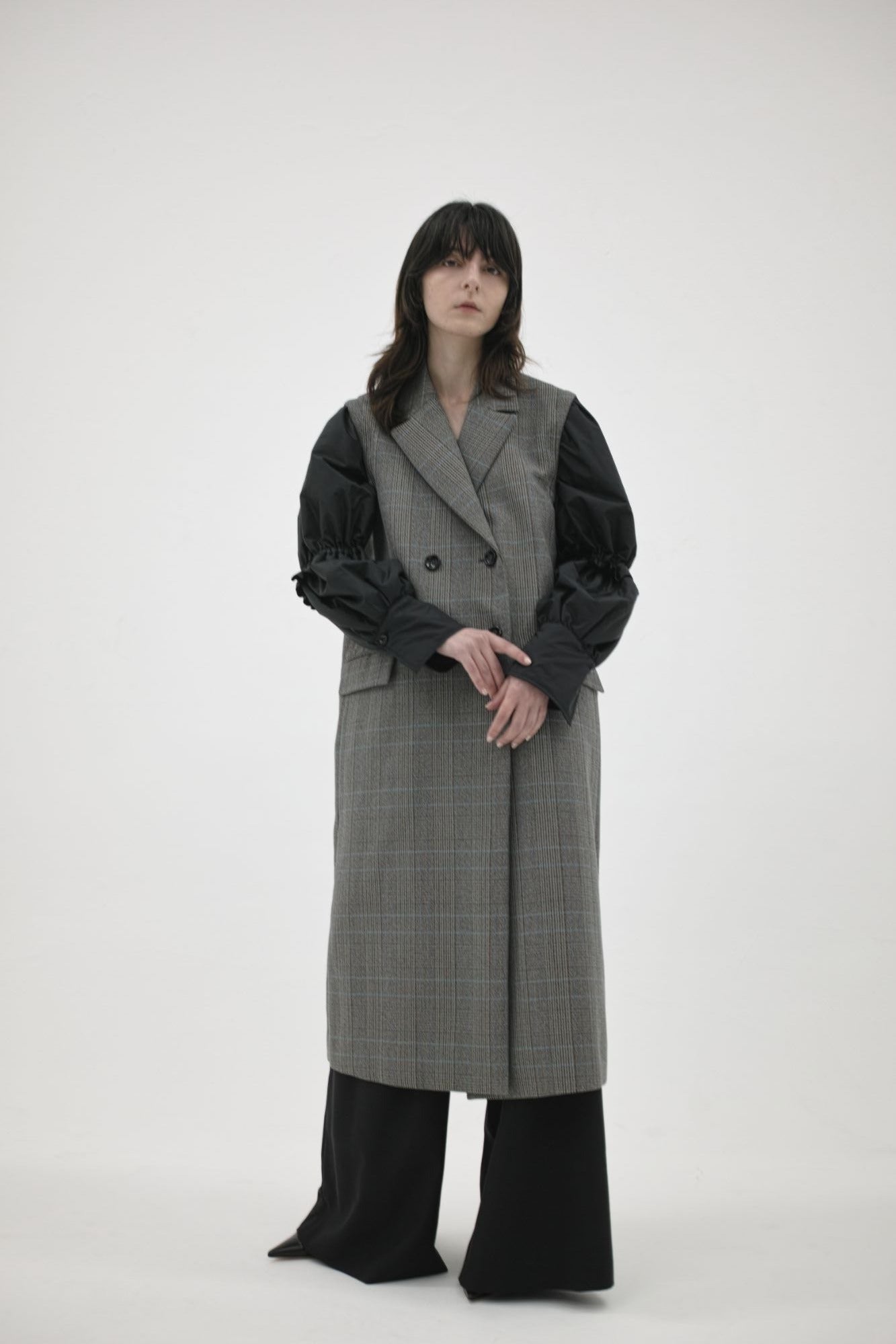 秋口は袖を外して、ロング゙ジレとしてブラウスやニットに組み合わせて、寒くなってきたら中綿入りの袖を付けて配色のコートとしてお楽しみください。