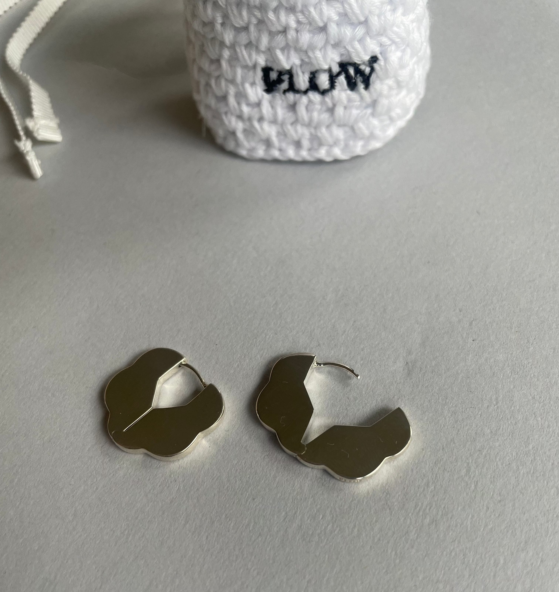 シンプルな平面状のフラワーモチーフのピアスは、キャッチレスタイプの耳を挟むデザインでまるでお花が耳のくっついているかのような不思議なデザイン。