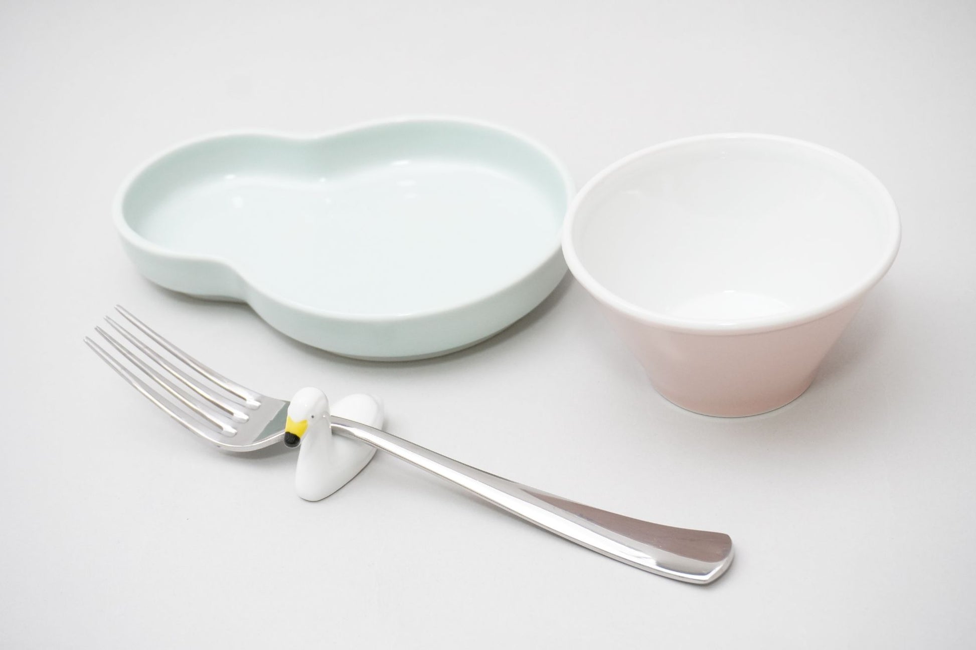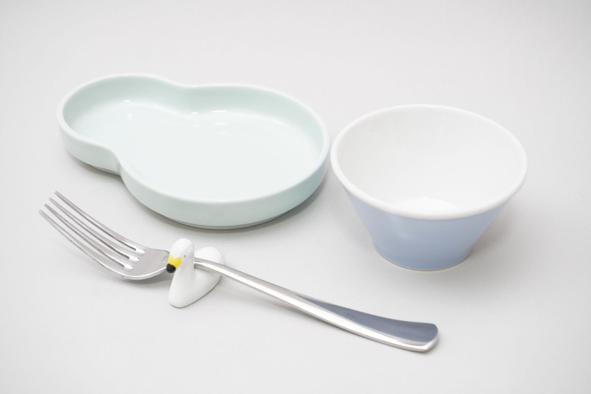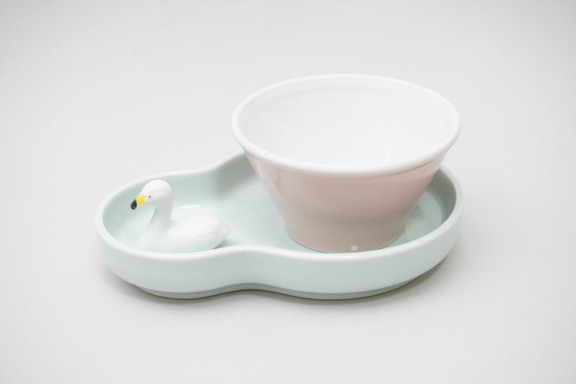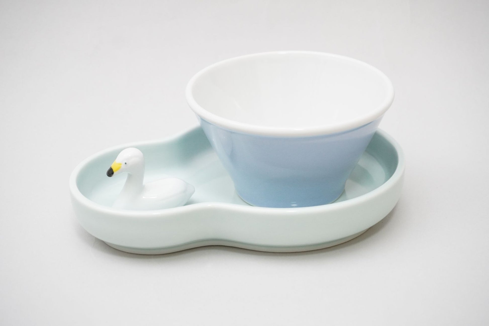 山型のボウルにひょうたん池のプレート、そこにちょこんと浮かぶスワンのレスト。パステルカラーが可愛らしい、眺めるだけで心が弾むキッズセットです。