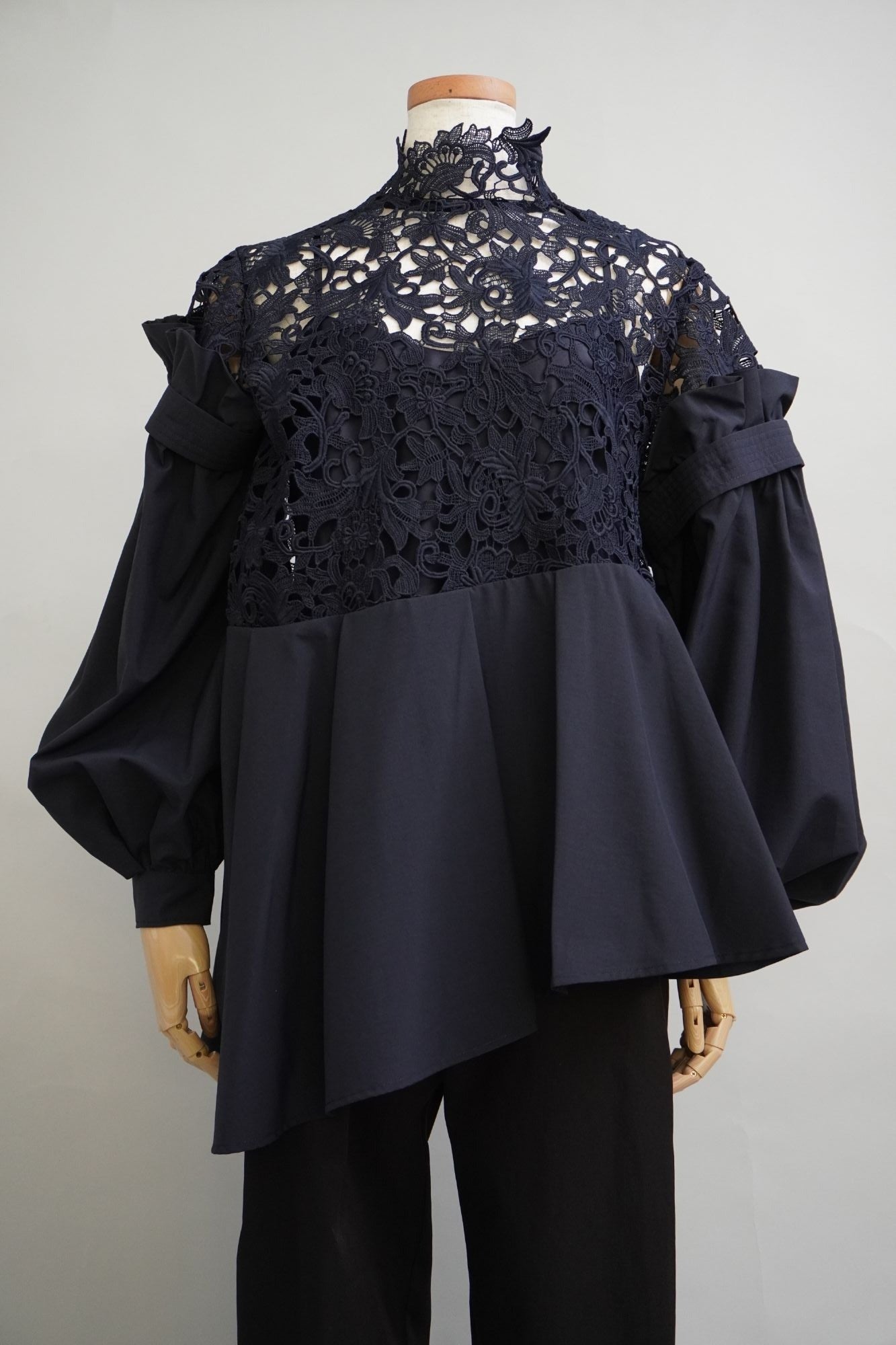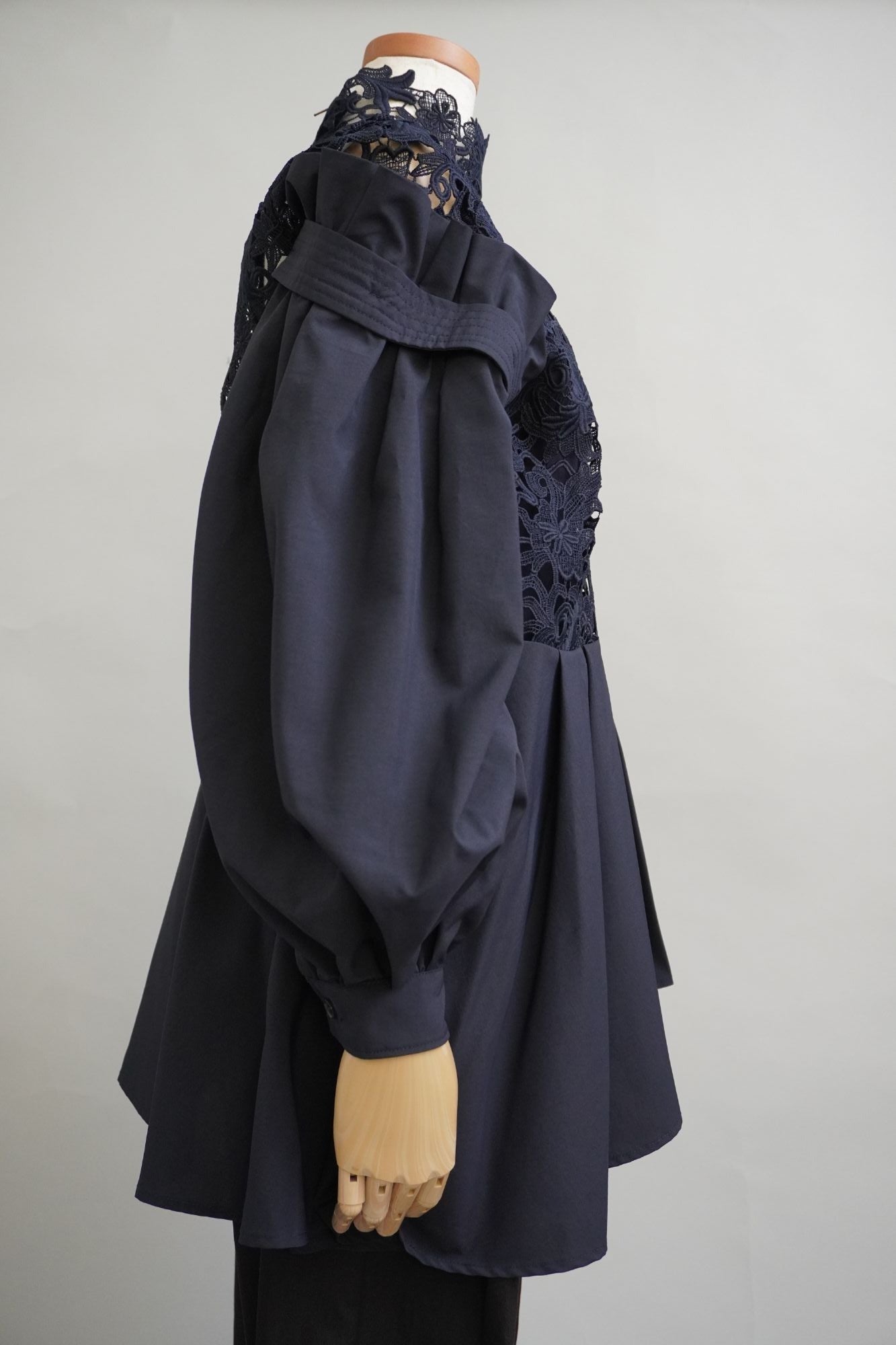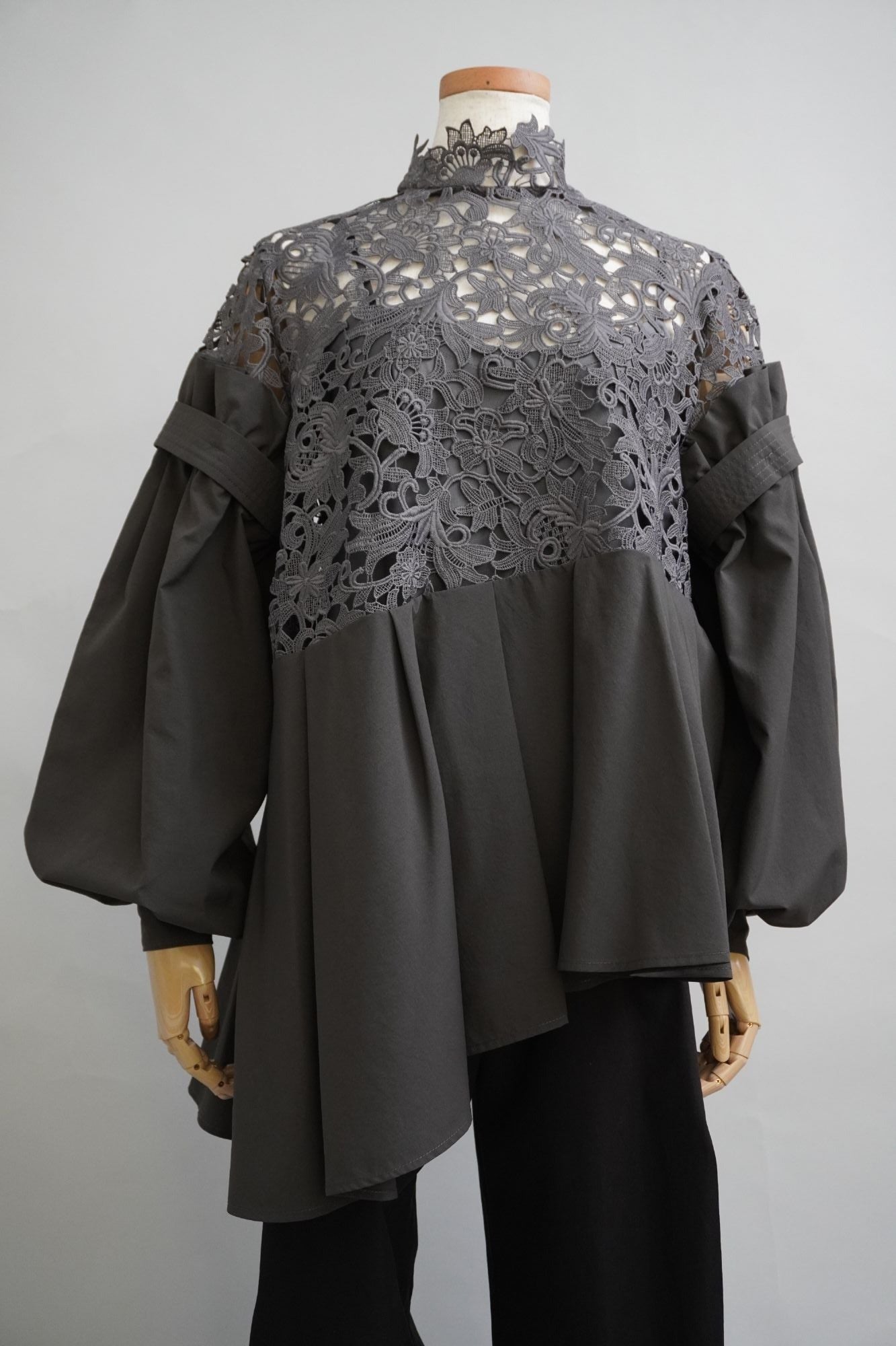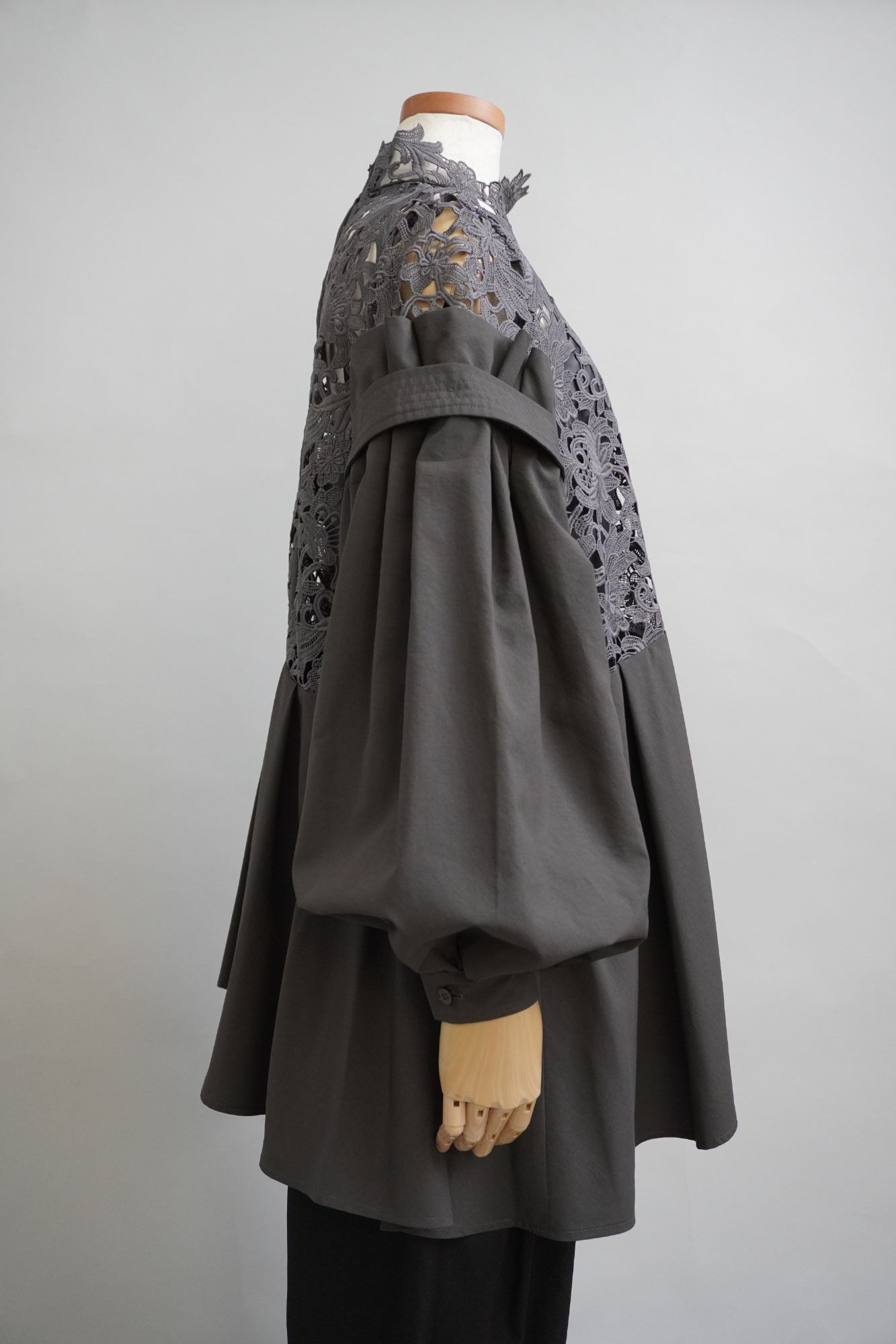 オリジナルのレース生地にポリエステルの軽い生地を組み合わせた商品で、 袖と身頃の切り替えによる分量感を出し全体にゆったりしたシルエットですが、布帛素材の軽さで女性らしさを表現しております。