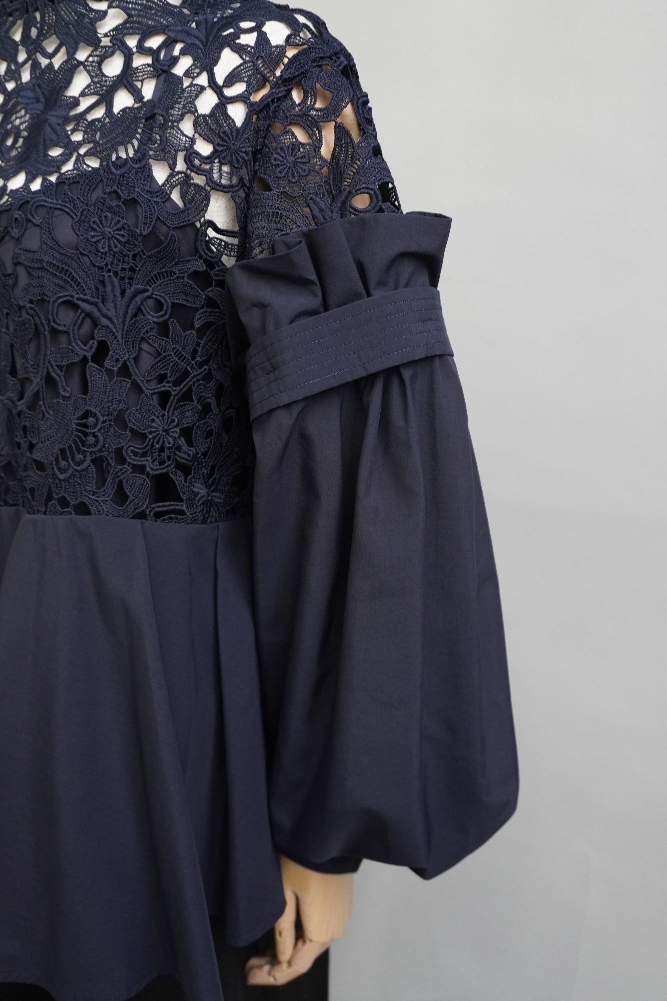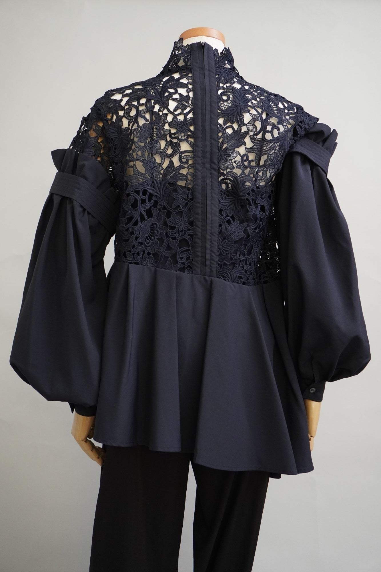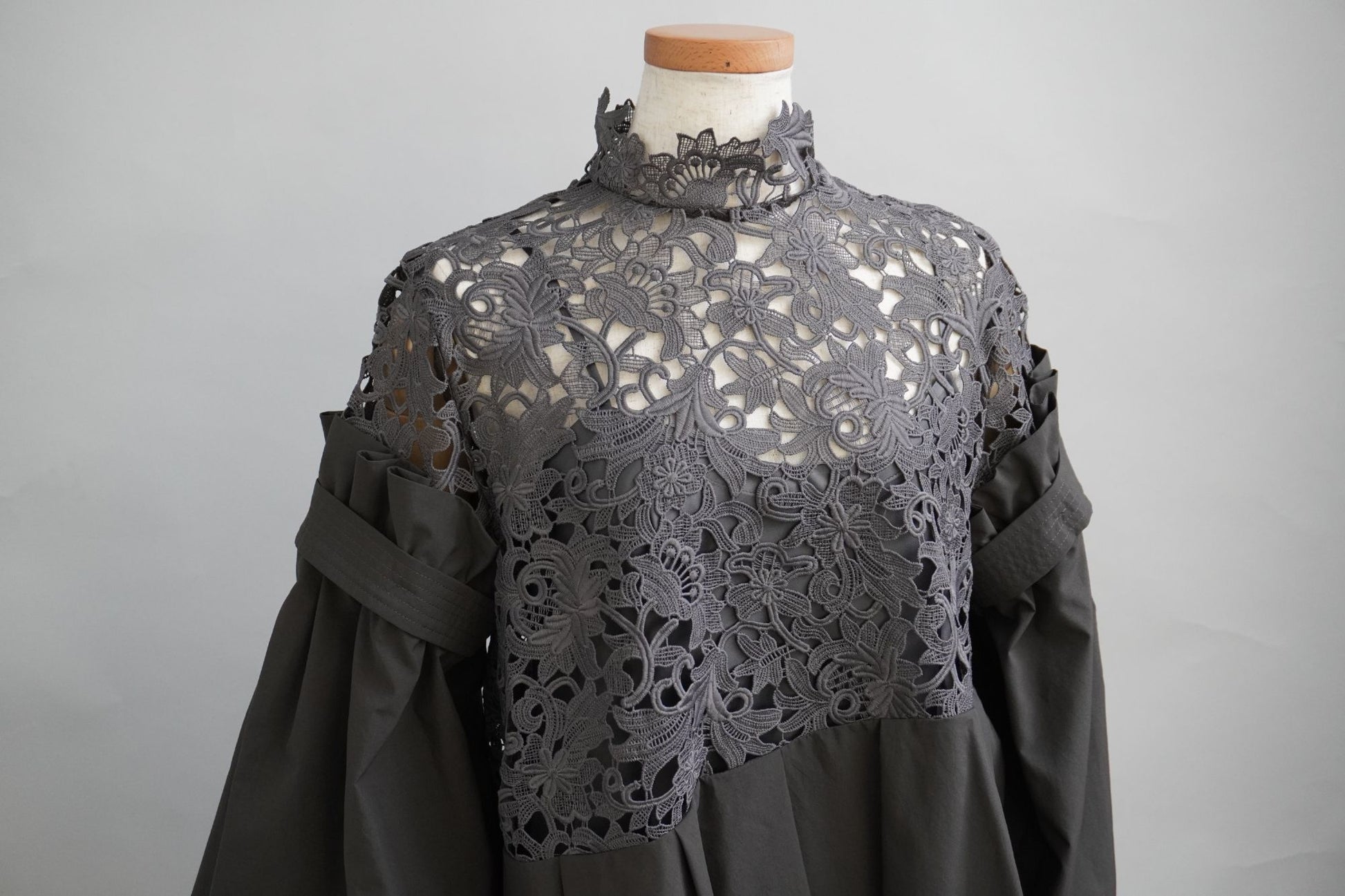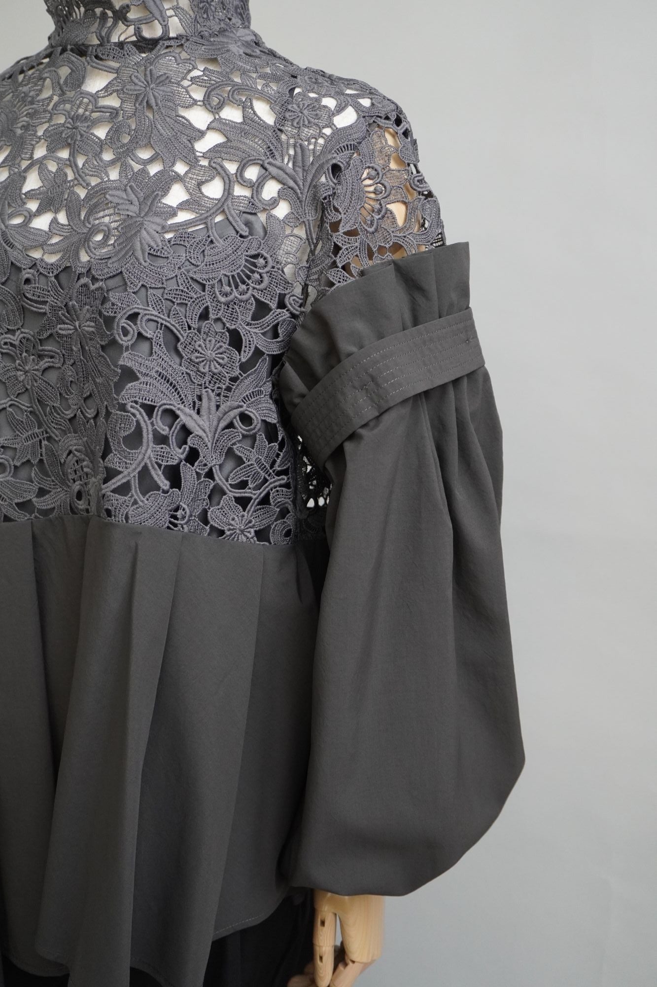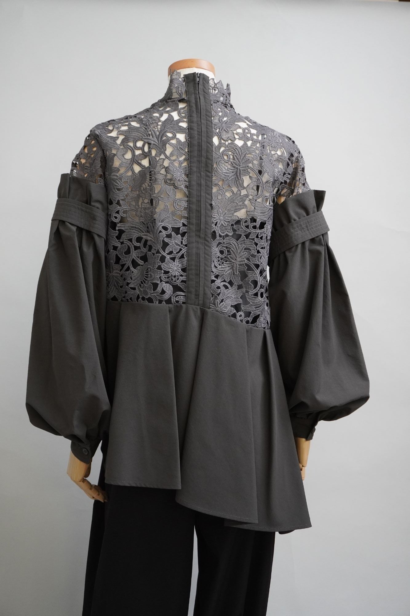 オリジナルのレース生地にポリエステルの軽い生地を組み合わせた商品で、 袖と身頃の切り替えによる分量感を出し全体にゆったりしたシルエットですが、布帛素材の軽さで女性らしさを表現しております。