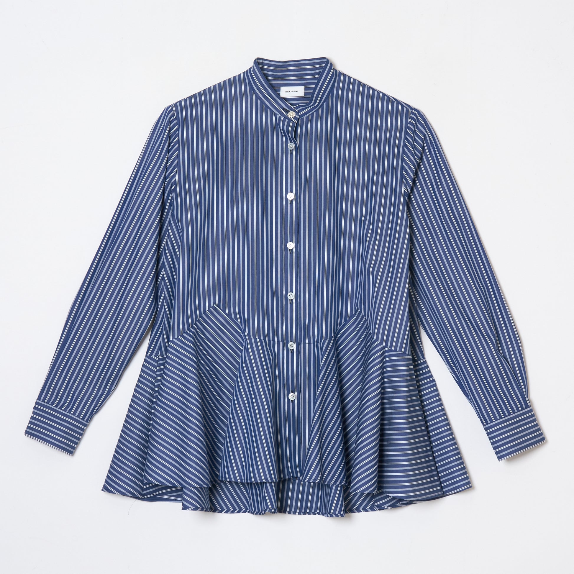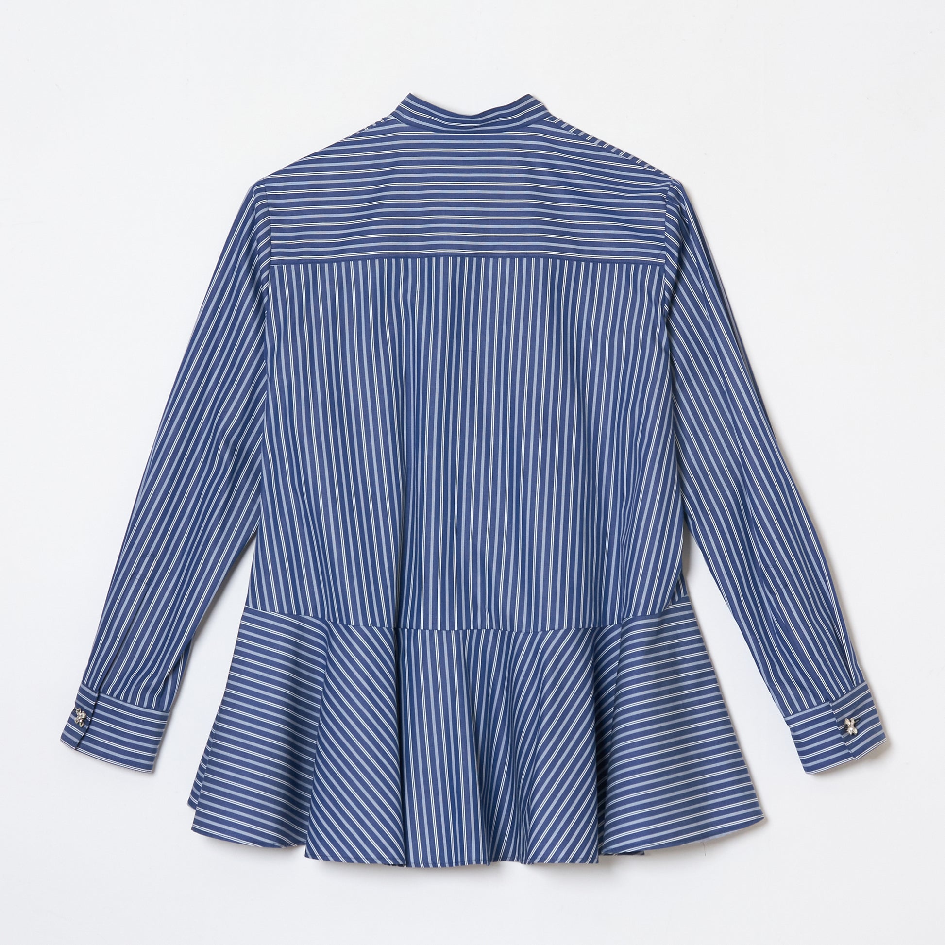 ペプラム調のシャツは、スタンドカラーにストライプ柄とユニークなデザインが楽しめる一着です。パンツスタイルはもちろん、スカートとの相性も◎