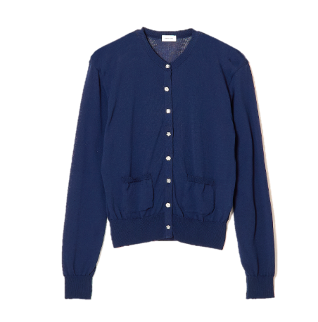 シンプルなスタイルのカーディガンは、ボタンに遊び心を効かせた1着。シアー素材でオールシーズン活躍するアイテムです。