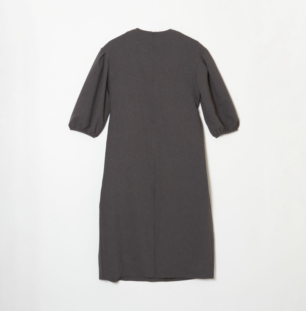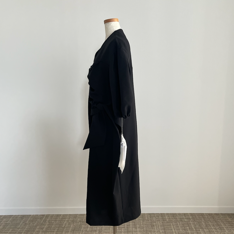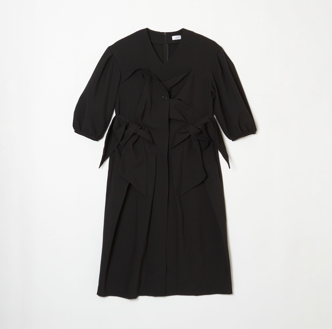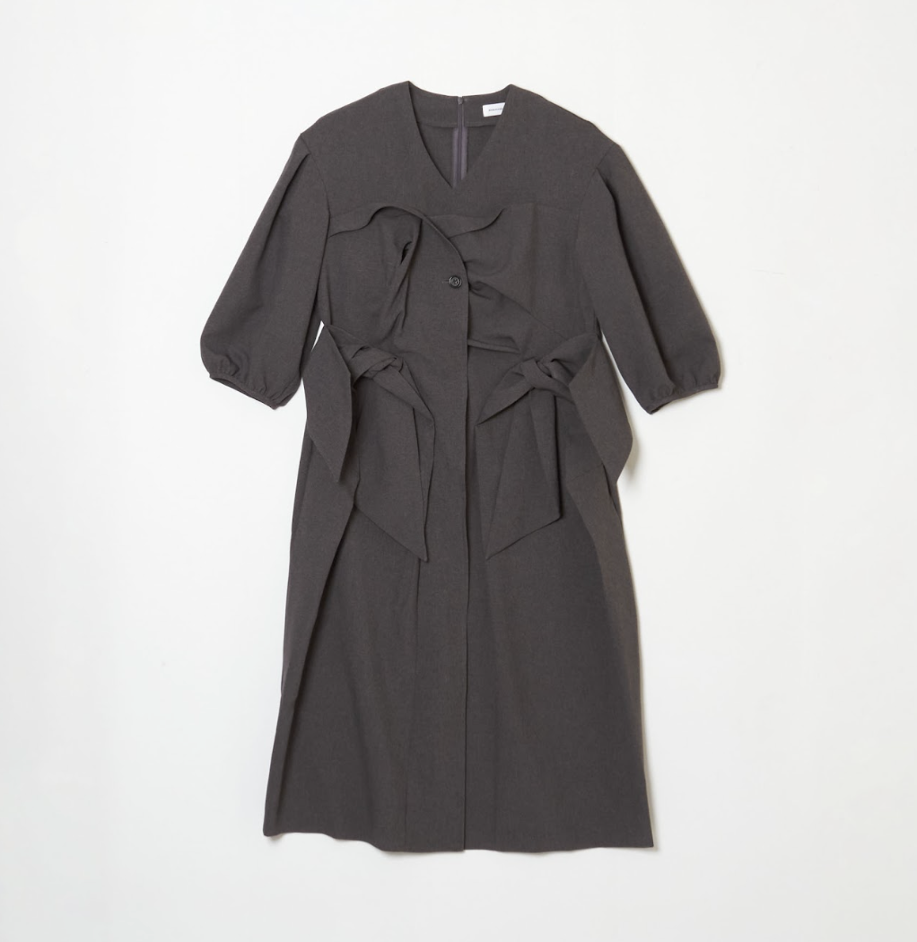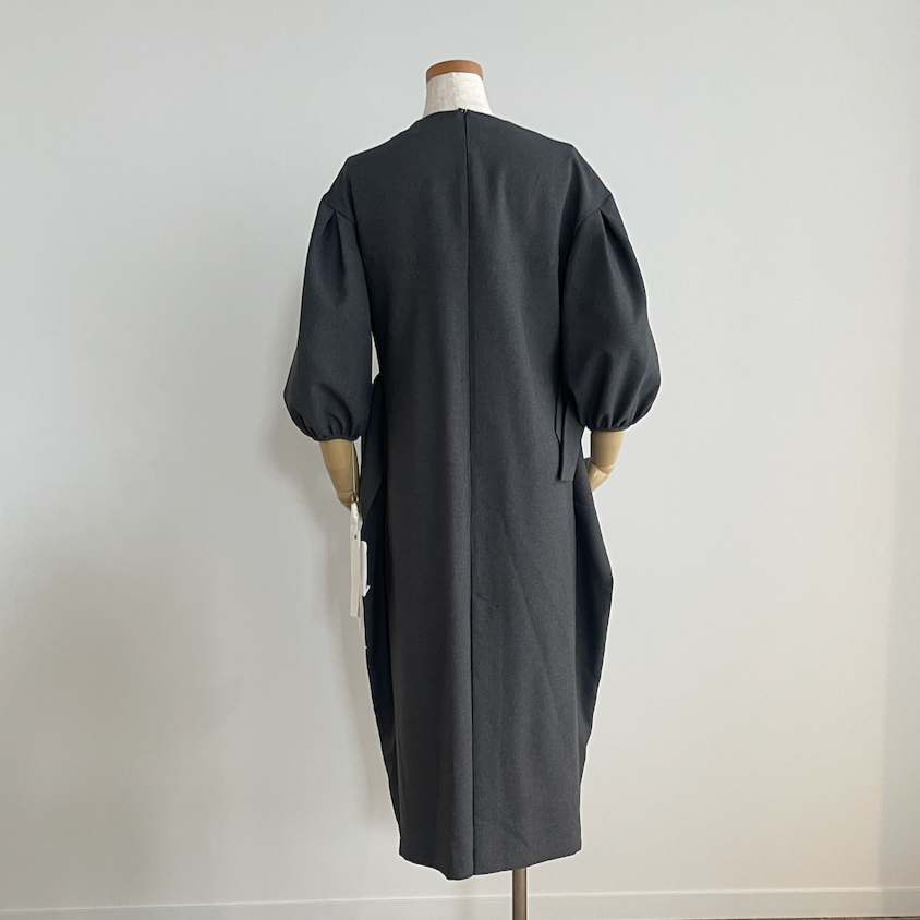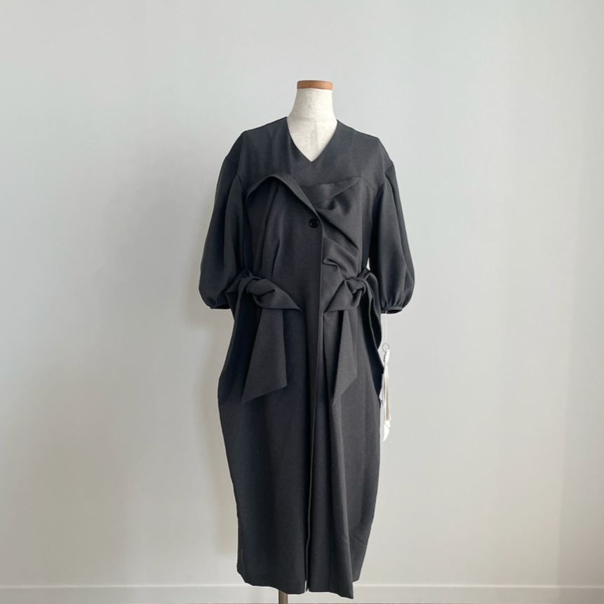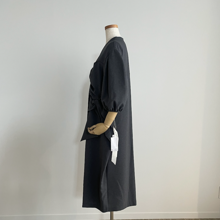 重ね着風のユニークなワンピースは、身につけることでリボン部分がより立体感的になるデザインです。さらっとオチ感のある素材で、美しいシルエットを楽しめる一着となっています。落ち着いたグレーとブラックの2色展開のアイテムです。