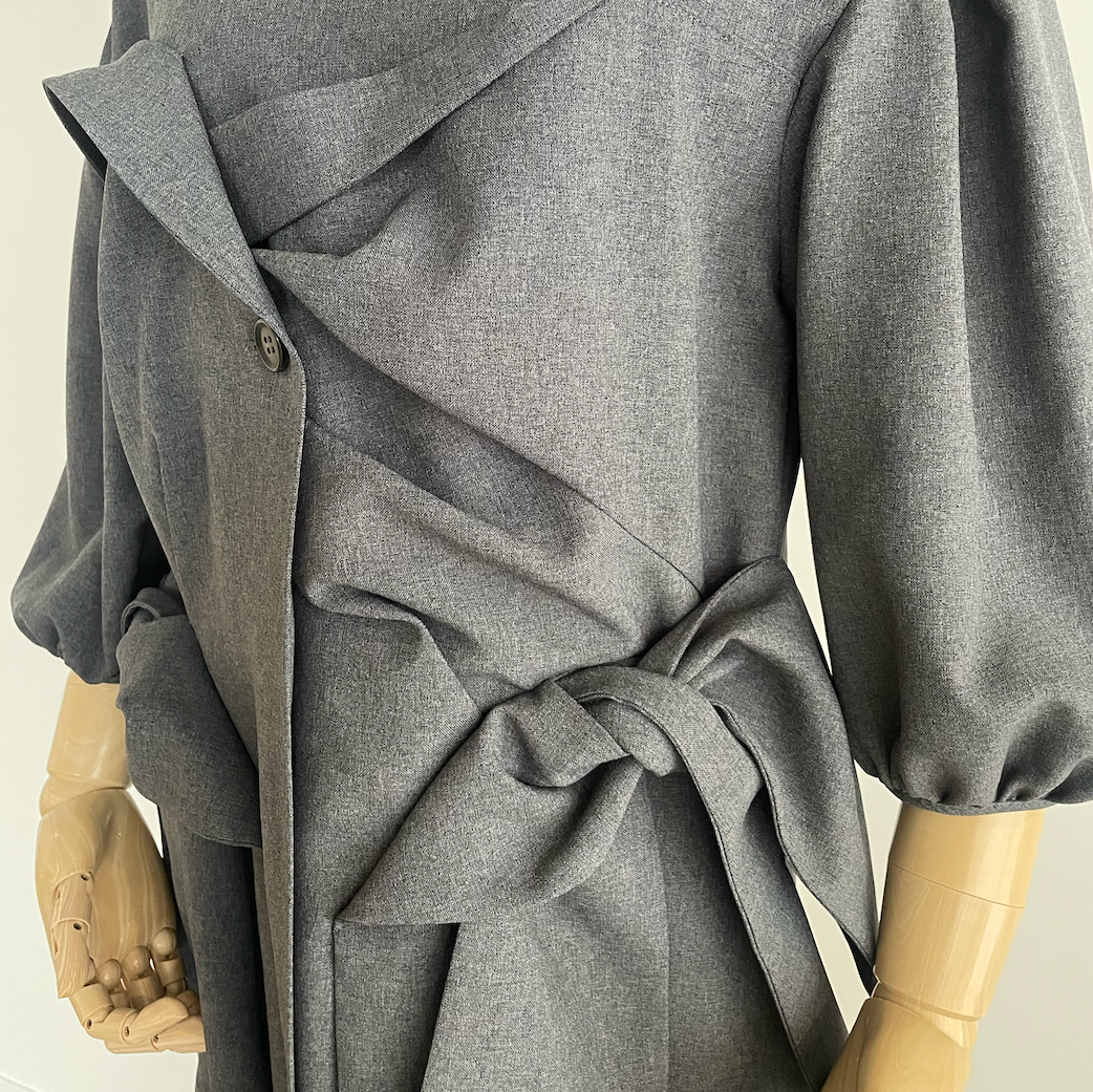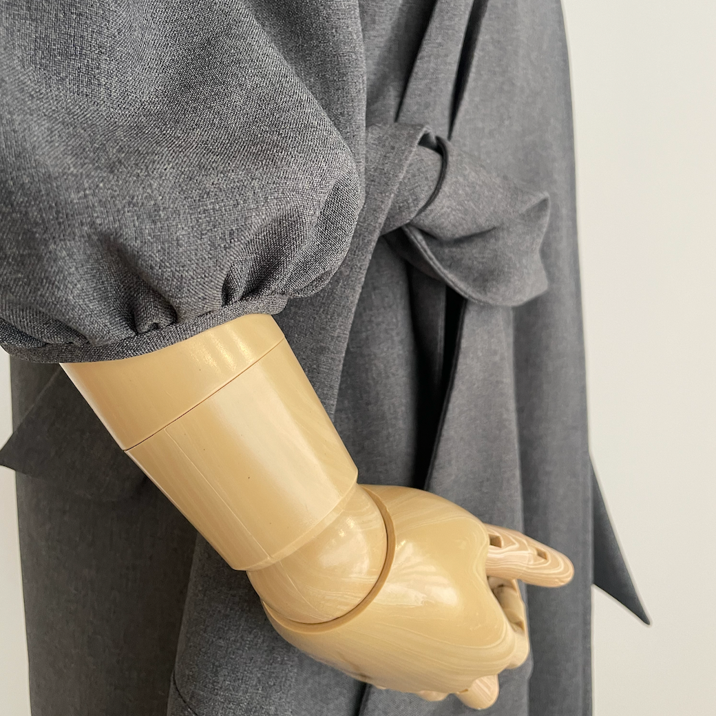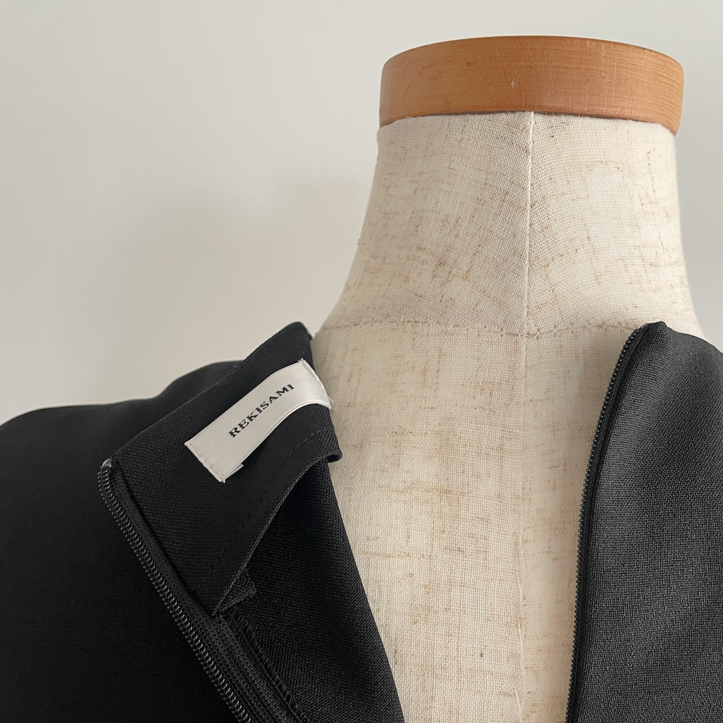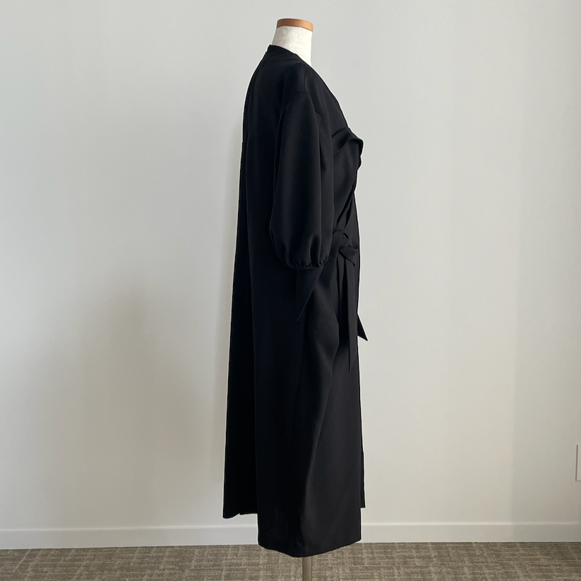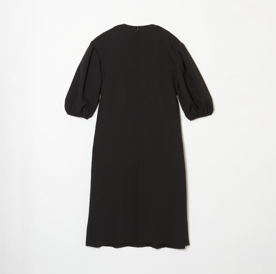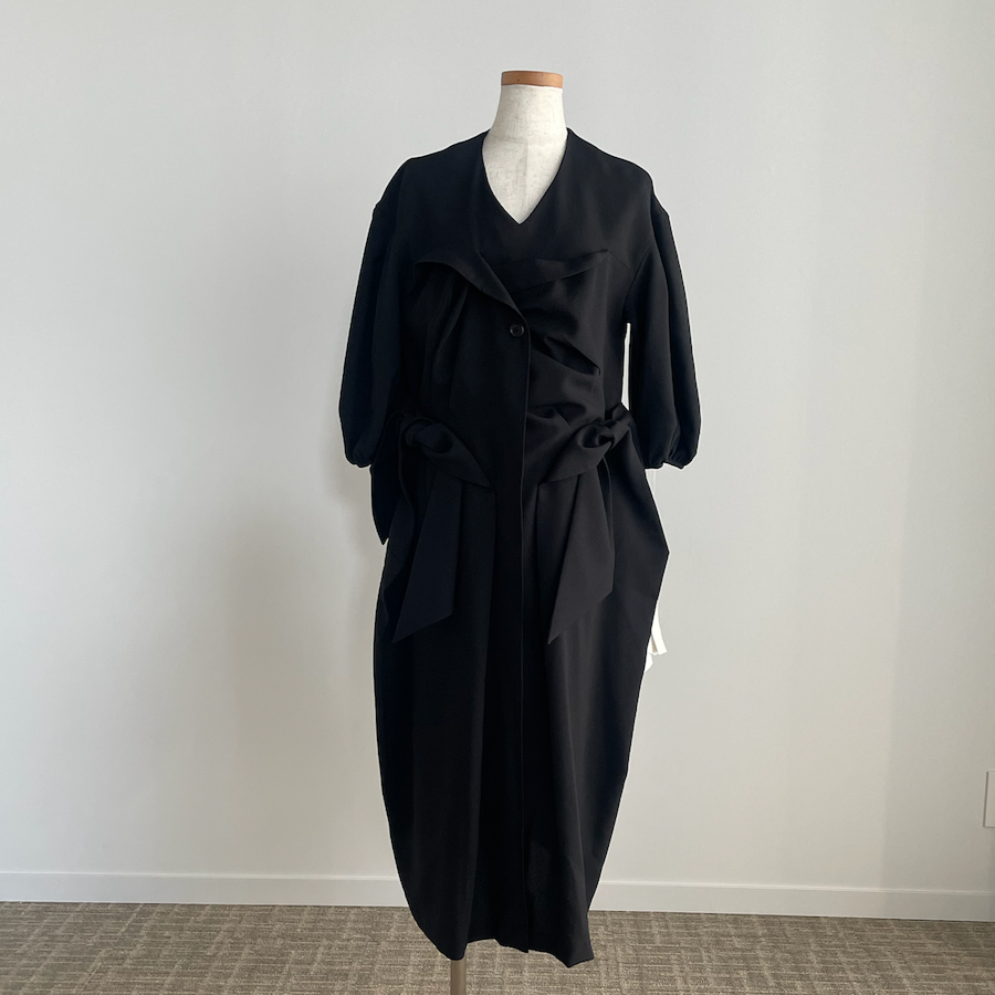 重ね着風のユニークなワンピースは、身につけることでリボン部分がより立体感的になるデザインです。さらっとオチ感のある素材で、美しいシルエットを楽しめる一着となっています。落ち着いたグレーとブラックの2色展開のアイテムです。